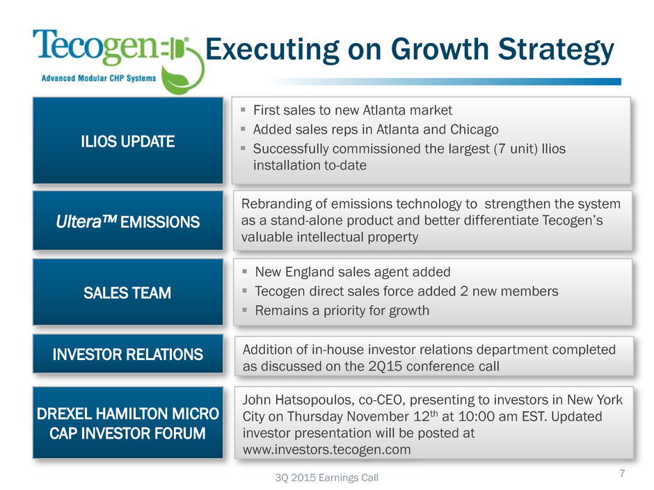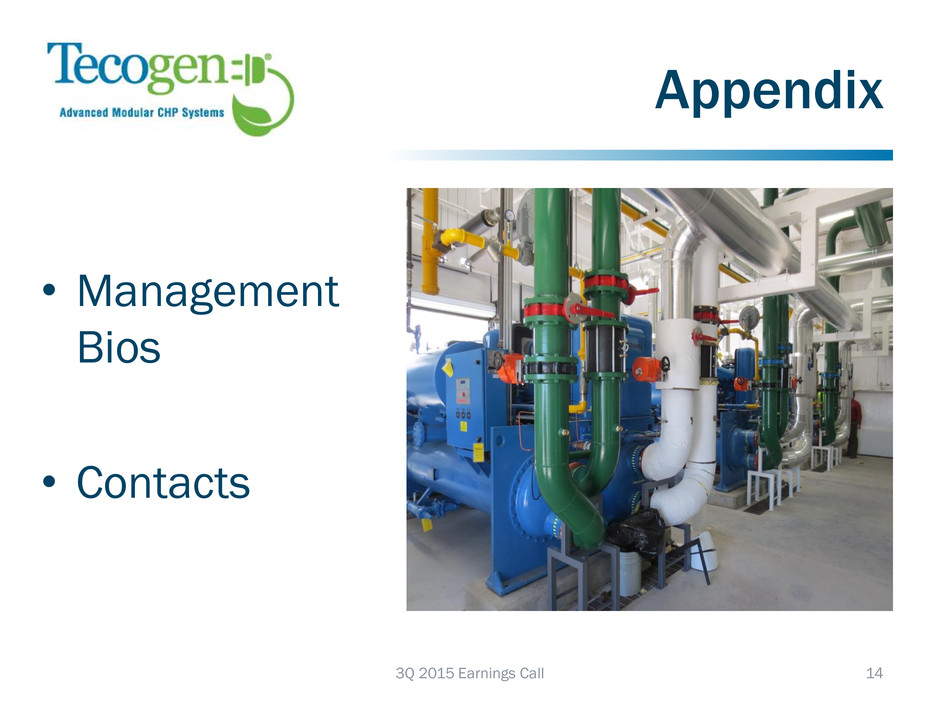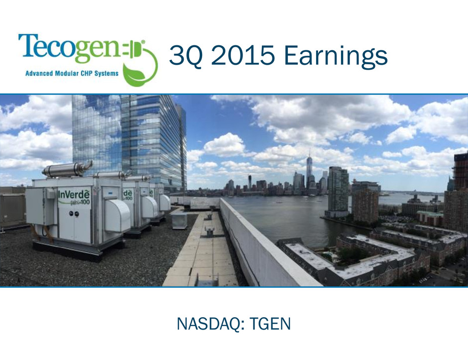 Contact Information 16 Company Information Tecogen Inc. 45 First Avenue Waltham, MA 02451 www.tecogen.com Contact John Hatsopoulos, Co-CEO 781.622.1122 John.Hatsopoulos@tecogen.com Ariel Babcock CFA, Director of Investor Relations 781.466.6413 Ariel.Babcock@tecogen.com 3Q 2015 Earnings Call