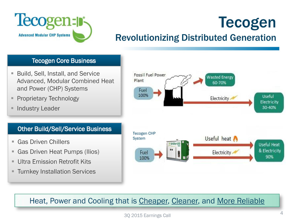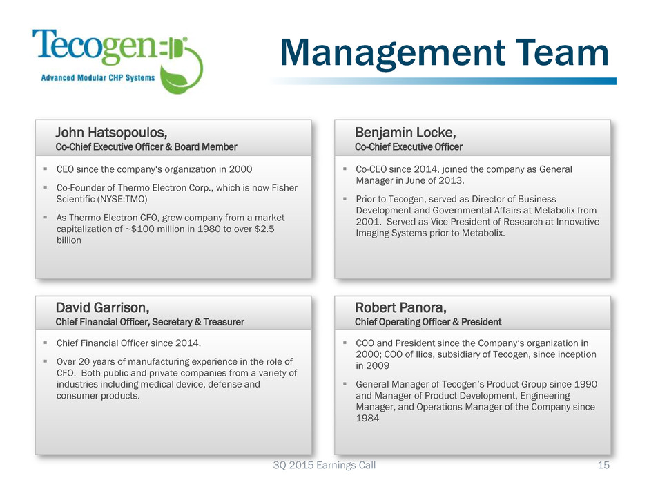 Participants John Hatsopoulos •Co-Chief Executive Officer, Director Benjamin Locke •Co-Chief Executive Officer Robert Panora •President & Chief Operating Officer David Garrison •Chief Financial Officer Ariel Babcock •Director, Investor Relations 2 3Q 2015 Earnings Call