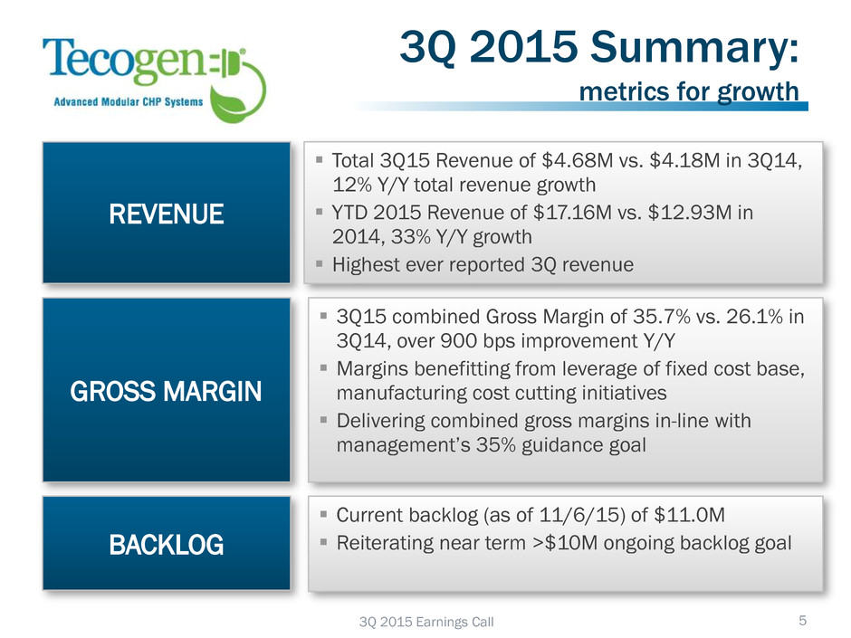 Tecogen Revolutionizing Distributed Generation 4 Other Build/Sell/Service Business Gas Driven Chillers Gas Driven Heat Pumps (Ilios) Ultra Emission Retrofit Kits Turnkey Installation Services Tecogen Core Business Build, Sell, Install, and Service Advanced, Modular Combined Heat and Power (CHP) Systems Proprietary Technology Industry Leader Tecogen CHP System Heat, Power and Cooling that is Cheaper, Cleaner, and More Reliable 3Q 2015 Earnings Call