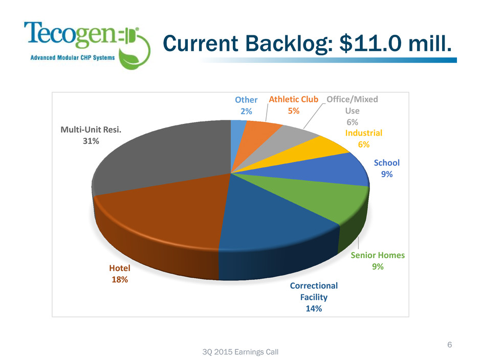 3Q 2015 Summary: metrics for growth REVENUE Total 3Q15 Revenue of $4.68M vs. $4.18M in 3Q14, 12% Y/Y total revenue growth YTD 2015 Revenue of $17.16M vs. $12.93M in 2014, 33% Y/Y growth Highest ever reported 3Q revenue GROSS MARGIN 3Q15 combined Gross Margin of 35.7% vs. 26.1% in 3Q14, over 900 bps improvement Y/Y Margins benefitting from leverage of fixed cost base, manufacturing cost cutting initiatives Delivering combined gross margins in-line with management’s 35% guidance goal BACKLOG Current backlog (as of 11/6/15) of $11.0M Reiterating near term >$10M ongoing backlog goal 5 3Q 2015 Earnings Call