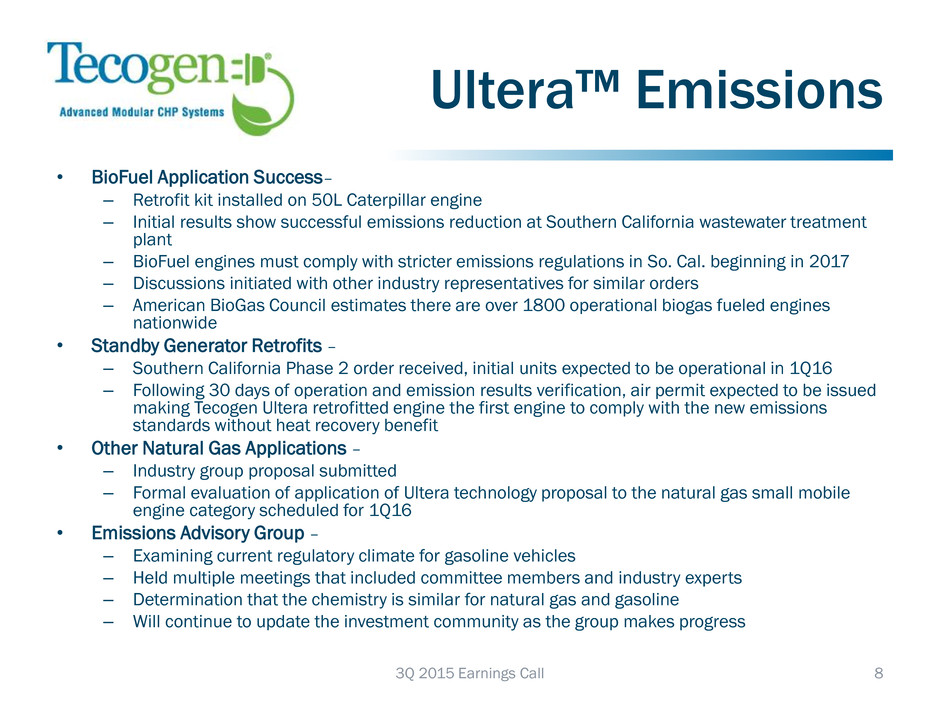 Executing on Growth Strategy ILIOS UPDATE First sales to new Atlanta market Added sales reps in Atlanta and Chicago Successfully commissioned the largest (7 unit) Ilios installation to-date Ultera™ EMISSIONS Rebranding of emissions technology to strengthen the system as a stand-alone product and better differentiate Tecogen’s valuable intellectual property SALES TEAM New England sales agent added Tecogen direct sales force added 2 new members Remains a priority for growth DREXEL HAMILTON MICRO CAP INVESTOR FORUM John Hatsopoulos, co-CEO, presenting to investors in New York City on Thursday November 12th at 10:00 am EST. Updated investor presentation will be posted at www.investors.tecogen.com INVESTOR RELATIONS Addition of in-house investor relations department completed as discussed on the 2Q15 conference call 7 3Q 2015 Earnings Call