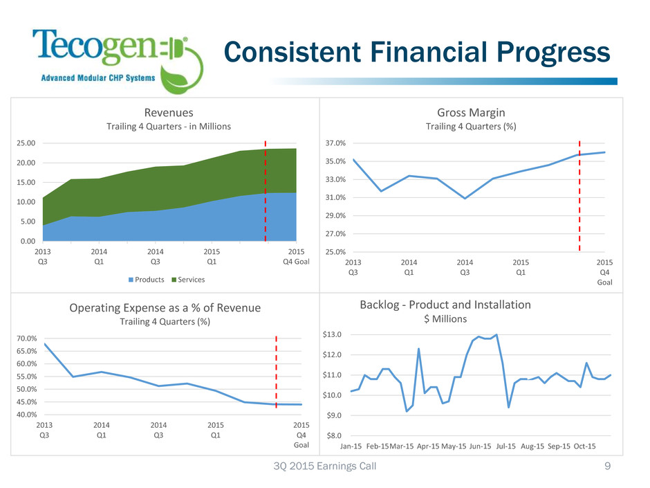 Ultera™ Emissions • BioFuel Application Success– – Retrofit kit installed on 50L Caterpillar engine – Initial results show successful emissions reduction at Southern California wastewater treatment plant – BioFuel engines must comply with stricter emissions regulations in So. Cal. beginning in 2017 – Discussions initiated with other industry representatives for similar orders – American BioGas Council estimates there are over 1800 operational biogas fueled engines nationwide • Standby Generator Retrofits – – Southern California Phase 2 order received, initial units expected to be operational in 1Q16 – Following 30 days of operation and emission results verification, air permit expected to be issued making Tecogen Ultera retrofitted engine the first engine to comply with the new emissions standards without heat recovery benefit • Other Natural Gas Applications – – Industry group proposal submitted – Formal evaluation of application of Ultera technology proposal to the natural gas small mobile engine category scheduled for 1Q16 • Emissions Advisory Group – – Examining current regulatory climate for gasoline vehicles – Held multiple meetings that included committee members and industry experts – Determination that the chemistry is similar for natural gas and gasoline – Will continue to update the investment community as the group makes progress 3Q 2015 Earnings Call 8