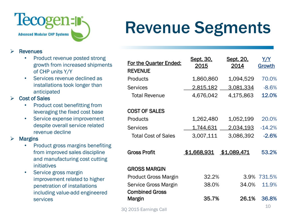 Consistent Financial Progress 9 3Q 2015 Earnings Call 0.00 5.00 10.00 15.00 20.00 25.00 2013 Q3 2014 Q1 2014 Q3 2015 Q1 2015 Q4 Goal Revenues Trailing 4 Quarters - in Millions Products Services 25.0% 27.0% 29.0% 31.0% 33.0% 35.0% 37.0% 2013 Q3 2014 Q1 2014 Q3 2015 Q1 2015 Q4 Goal Gross Margin Trailing 4 Quarters (%) 40.0% 45.0% 50.0% 55.0% 60.0% 65.0% 70.0% 2013 Q3 2014 Q1 2014 Q3 2015 Q1 2015 Q4 Goal Operating Expense as a % of Revenue Trailing 4 Quarters (%) $8.0 $9.0 $10.0 $11.0 $12.0 $13.0 Jan-15 Feb-15Mar-15 Apr-15 May-15 Jun-15 Jul-15 Aug-15 Sep-15 Oct-15 Backlog - Product and Installation $ Millions