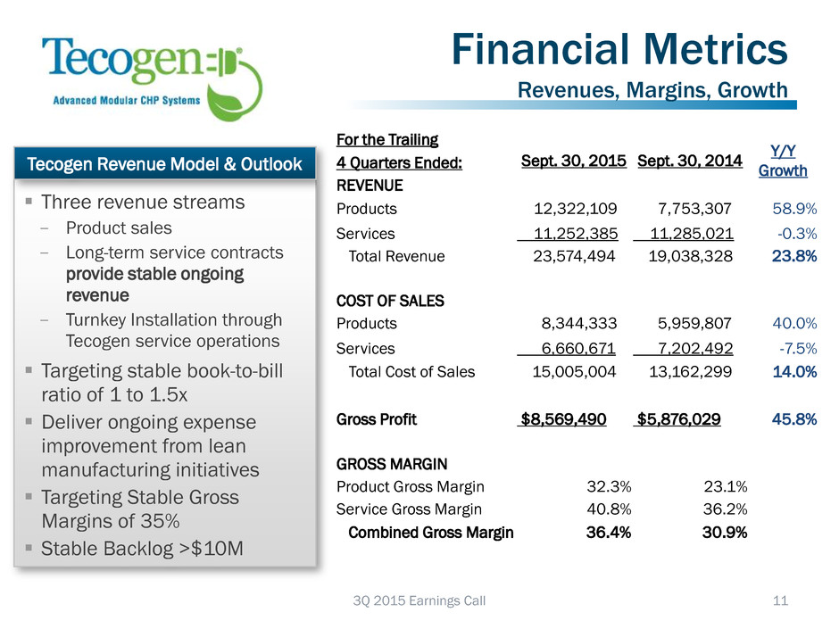 Revenue Segments 10 3Q 2015 Earnings Call Revenues • Product revenue posted strong growth from increased shipments of CHP units Y/Y • Services revenue declined as installations took longer than anticipated Cost of Sales • Product cost benefitting from leveraging the fixed cost base • Service expense improvement despite overall service related revenue decline Margins • Product gross margins benefiting from improved sales discipline and manufacturing cost cutting initiatives • Service gross margin improvement related to higher penetration of installations including value-add engineered services Sept. 30, 2015 Sept. 20, 2014 Y/Y Growth For the Quarter Ended: REVENUE Products 1,860,860 1,094,529 70.0% Services 2,815,182 3,081,334 -8.6% Total Revenue 4,676,042 4,175,863 12.0% COST OF SALES Products 1,262,480 1,052,199 20.0% Services 1,744,631 2,034,193 -14.2% Total Cost of Sales 3,007,111 3,086,392 -2.6% Gross Profit $1,668,931 $1,089,471 53.2% GROSS MARGIN Product Gross Margin 32.2% 3.9% 731.5% Service Gross Margin 38.0% 34.0% 11.9% Combined Gross Margin 35.7% 26.1% 36.8%
