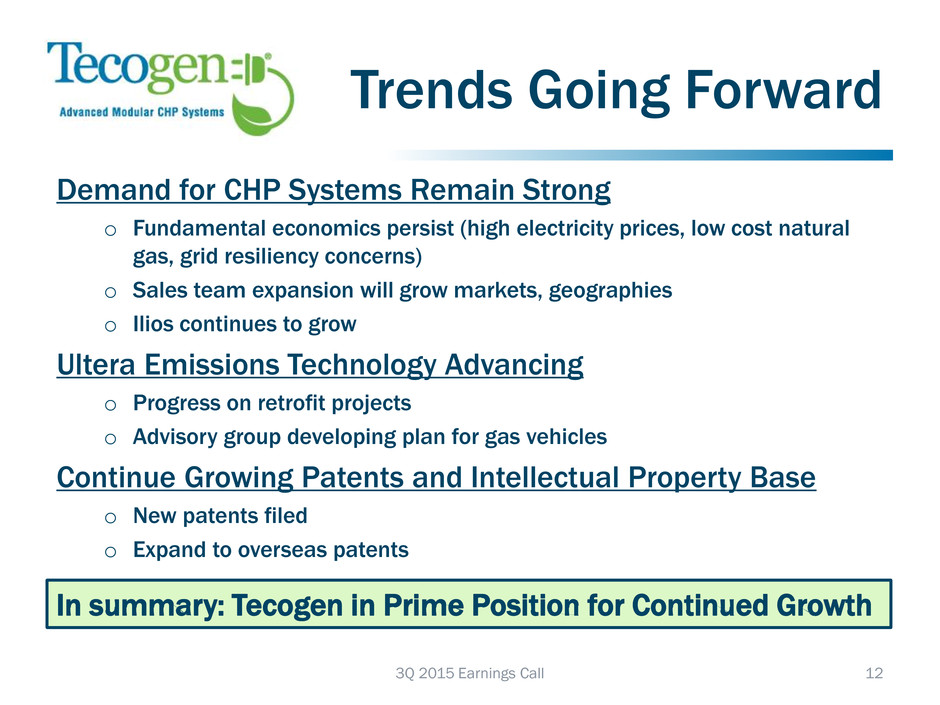 Financial Metrics Revenues, Margins, Growth Three revenue streams − Product sales − Long-term service contracts provide stable ongoing revenue − Turnkey Installation through Tecogen service operations Targeting stable book-to-bill ratio of 1 to 1.5x Deliver ongoing expense improvement from lean manufacturing initiatives Targeting Stable Gross Margins of 35% Stable Backlog >$10M Tecogen Revenue Model & Outlook 11 3Q 2015 Earnings Call For the Trailing Sept. 30, 2015 Sept. 30, 2014 Y/Y Growth 4 Quarters Ended: REVENUE Products 12,322,109 7,753,307 58.9% Services 11,252,385 11,285,021 -0.3% Total Revenue 23,574,494 19,038,328 23.8% COST OF SALES Products 8,344,333 5,959,807 40.0% Services 6,660,671 7,202,492 -7.5% Total Cost of Sales 15,005,004 13,162,299 14.0% Gross Profit $8,569,490 $5,876,029 45.8% GROSS MARGIN Product Gross Margin 32.3% 23.1% Service Gross Margin 40.8% 36.2% Combined Gross Margin 36.4% 30.9%