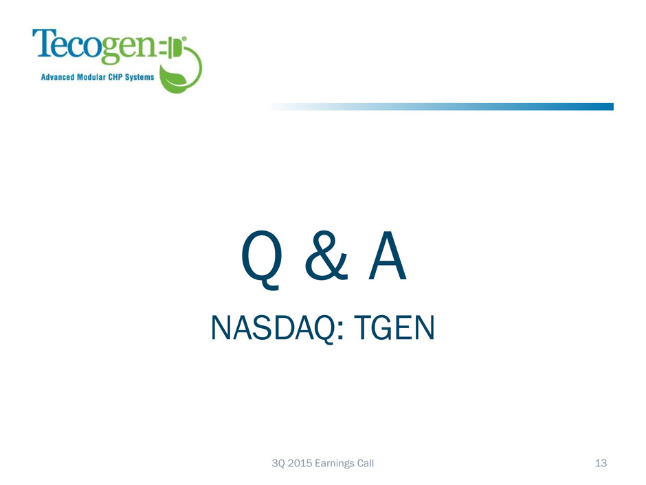 Trends Going Forward 3Q 2015 Earnings Call 12 Demand for CHP Systems Remain Strong o Fundamental economics persist (high electricity prices, low cost natural gas, grid resiliency concerns) o Sales team expansion will grow markets, geographies o Ilios continues to grow Ultera Emissions Technology Advancing o Progress on retrofit projects o Advisory group developing plan for gas vehicles Continue Growing Patents and Intellectual Property Base o New patents filed o Expand to overseas patents In summary: Tecogen in Prime Position for Continued Growth