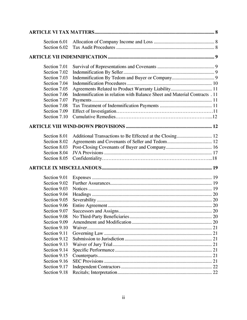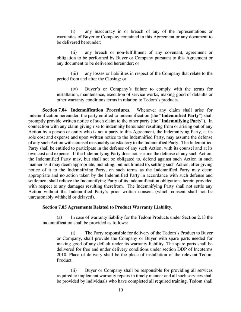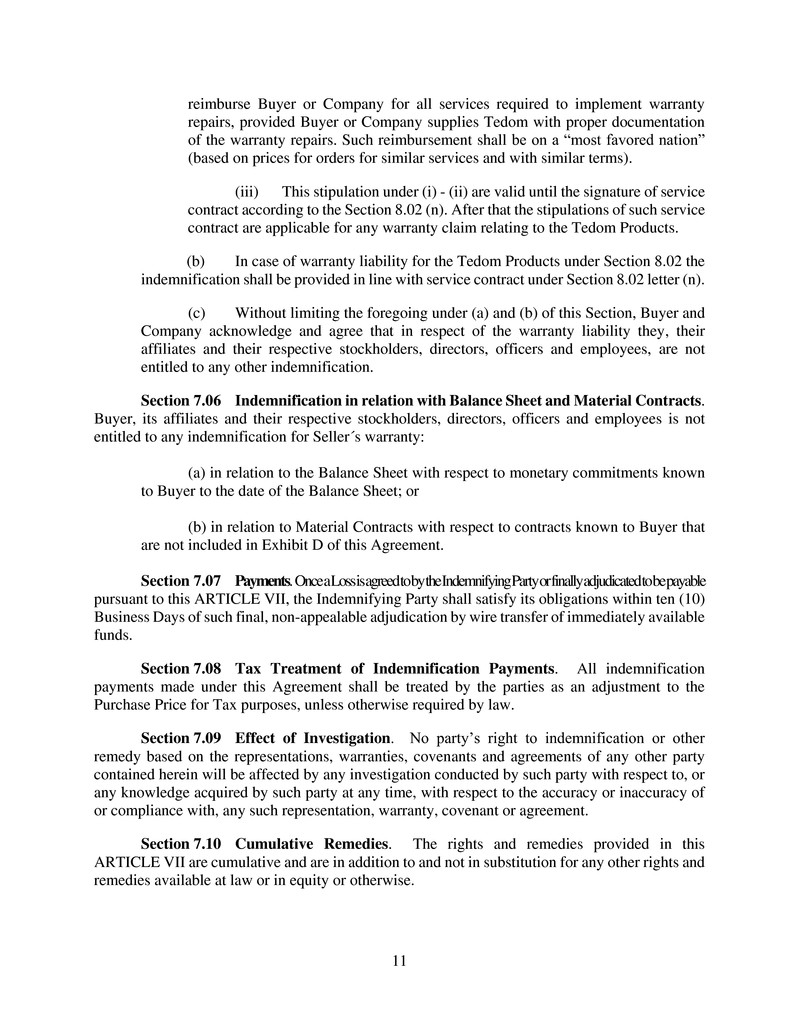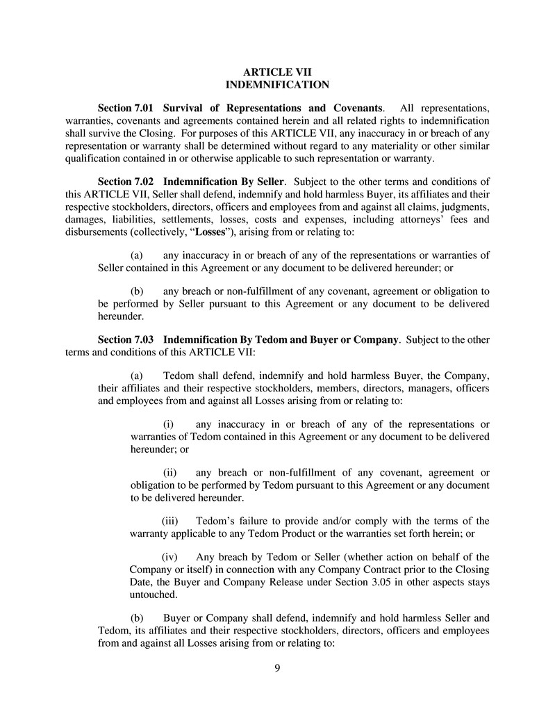 Section 7.03 Indemnification By Tedom and Buyer or Company ................................... 9
