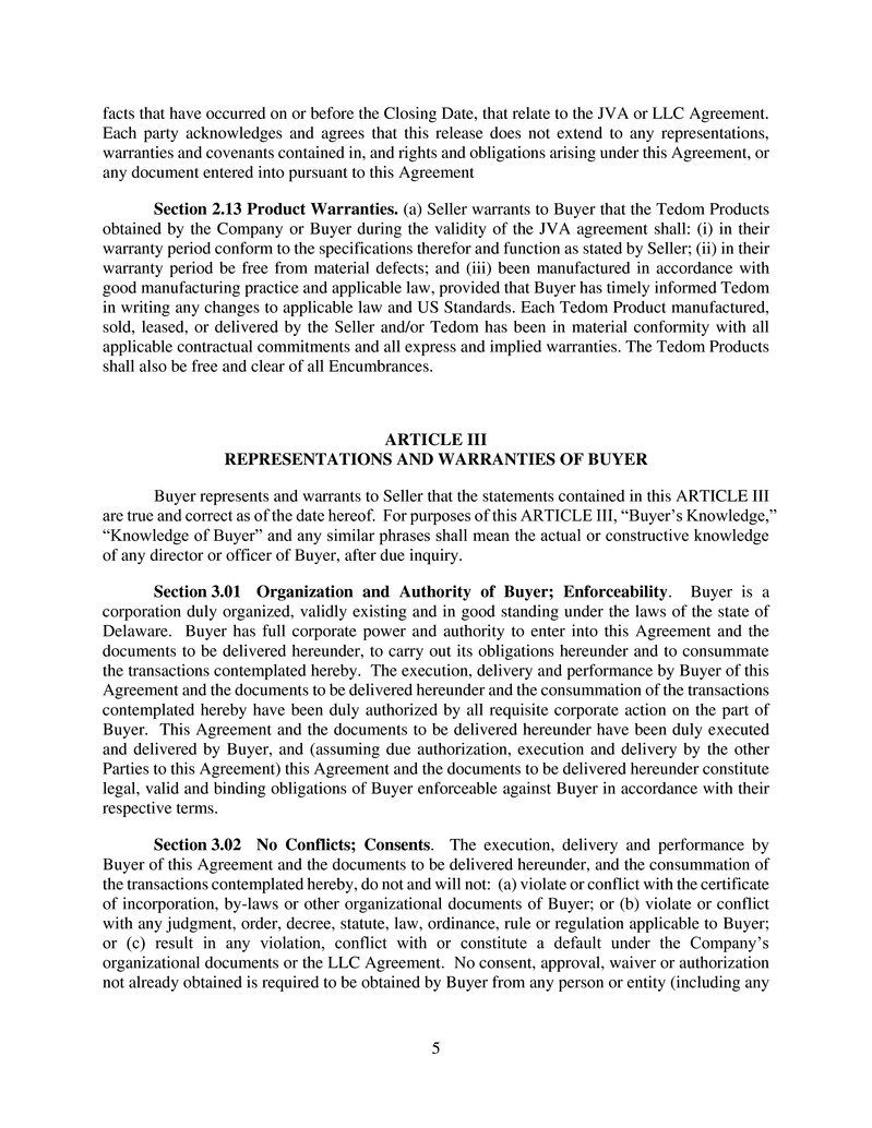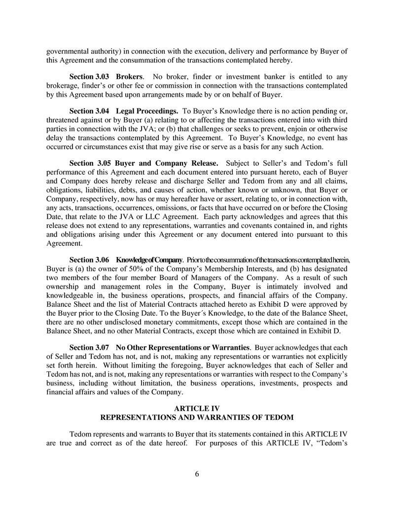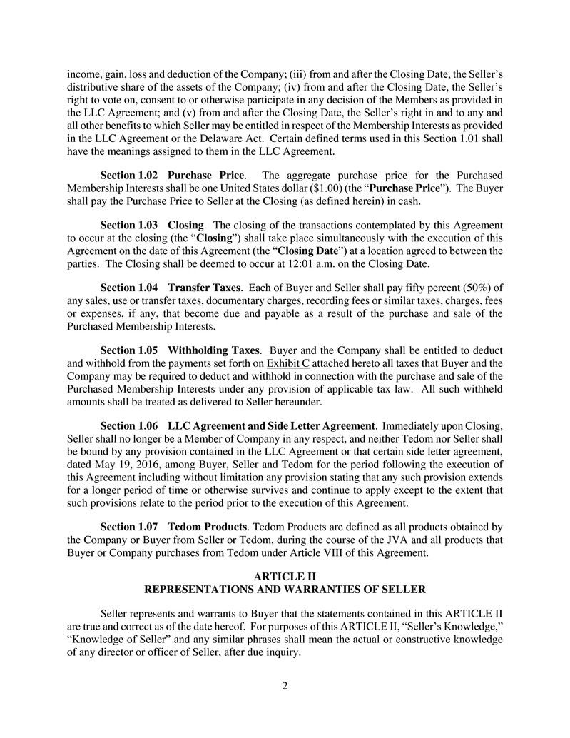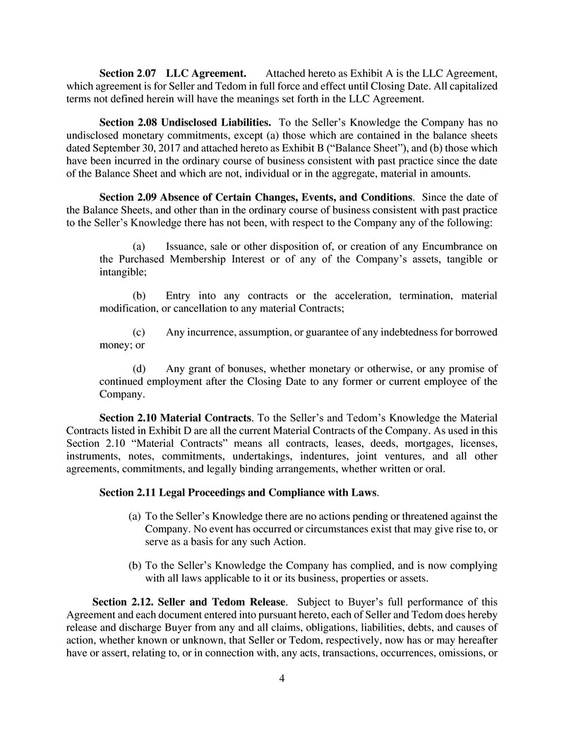 Section 2.12 Seller and Tedom Release…………………………………………………4
