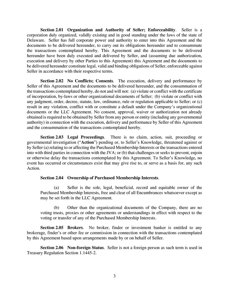 Section 2.01 Organization and Authority of Seller; Enforceability ................................. 3
