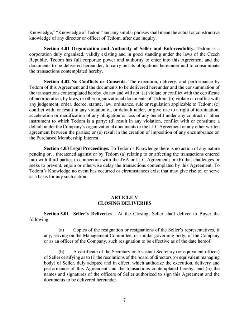 Section 5.01 Seller’s Deliveries ....................................................................................... 7