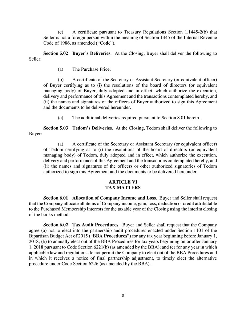 Section 5.02 Buyer’s Deliveries ...................................................................................... 8
