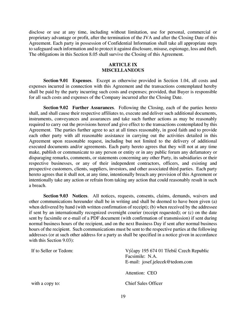 ARTICLE IX MISCELLANEOUS ........................................................................................... 19