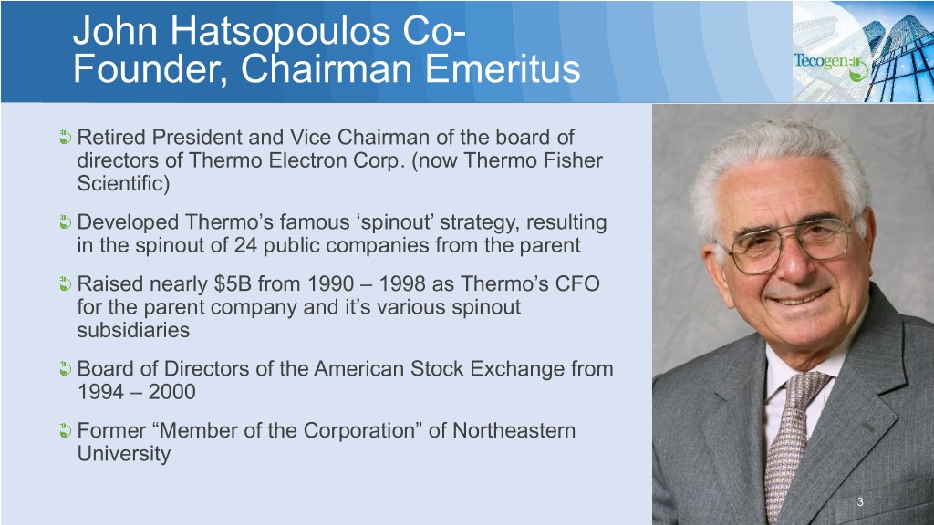 Board of Directors Angelina Galiteva Charles Maxwell Deanna Peterson John Hatsopoulos Director, Board Chairwoman Director, Chair of Audit Committee Director Advisor to the board ▪ ▪ ▪ ▪ Chair of the Company since 2005 Company Director since 2001 Company Director since 2017 Chairmain Emeritus, Retired CEO and Director of the Company ▪ ▪ 40 years of energy sector specific ▪ Chief Business Officer of AVROBIO Founder and Chair of the Board for the organization in 2000 to 2018 Renewables 100 Policy Institute, a non- experience with major oil companies and since 2016 ▪ profit entity dedicated to the global investment banking firms Co-Founder for Thermo Electron ▪ Vice President of Business Development advancement of renewable energy ▪ Corp., now Thermo Fisher Scientific Former Senior Energy Analyst with at Shire Pharmaceuticals from 2009 to solutions since 2008 (NYSE: TMO) Weeden & Co. 2015 ▪ ▪ As Thermo Electron CFO, grew Chairperson at the World Council for ▪ Board Chairman of American DG Energy, ▪ Led development, priorization and company from a market Renewable Energy and Board member Inc. of the Governors of the California ISO execution of Shire‘s overall corporate capitalization of ~$100 million in and business development strategies 1980 to over $2.5 billion Ahmed Ghoniem Keith Davidson Benjamin Locke Director Director Director ▪ Company Director since 2008 ▪ Company Director since 2016 ▪ Company Director since 2018 ▪ Ronald C. Crane Professor of ▪ President of DE Solutions, a consulting ▪ Joined company as general Mechanical Engineering at MIT and engineering firm serving the manager in 2013 distributed energy markets ▪ Director of the Center for 21st Century ▪ Director of Business Development Energy and Head of Energy Science ▪ Former Director of the Gas Research at Metabolix from 2001 to 2013 and Engineering at MIT Institute and past President of the ▪ Former Vice President of Research American Cogeneration Association ▪ Associate Fellow of the American at Innovative Imaging Systems Institute of Aeronautics and Astronautics ▪ 25 years of experience in energy and ▪ Responsible for Tecogen growth environmental technology development and profitability and implementation 21
