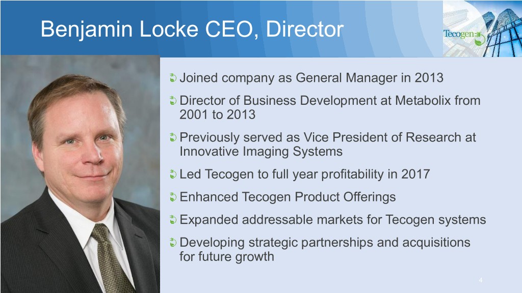 John Hatsopoulos Co- Founder, Chairman Emeritus Retired President and Vice Chairman of the board of directors of Thermo Electron Corp. (now Thermo Fisher Scientific) Developed Thermo’s famous ‘spinout’ strategy, resulting in the spinout of 24 public companies from the parent Raised nearly $5B from 1990 – 1998 as Thermo’s CFO for the parent company and it’s various spinout subsidiaries Board of Directors of the American Stock Exchange from 1994 – 2000 Former “Member of the Corporation” of Northeastern University 3