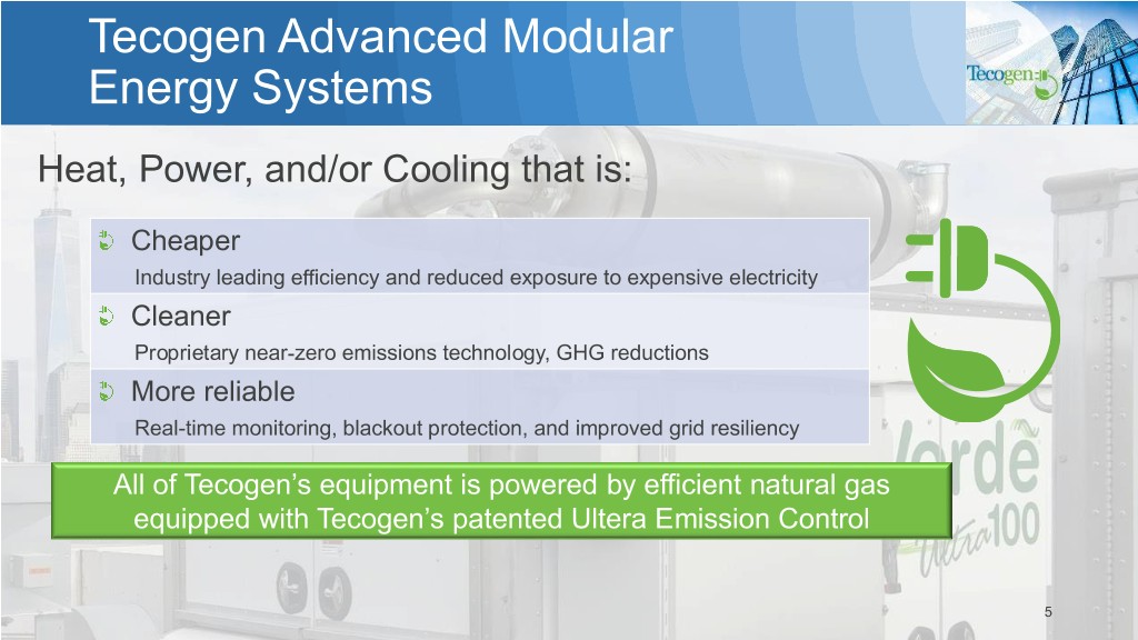 Benjamin Locke CEO, Director Joined company as General Manager in 2013 Director of Business Development at Metabolix from 2001 to 2013 Previously served as Vice President of Research at Innovative Imaging Systems Led Tecogen to full year profitability in 2017 Enhanced Tecogen Product Offerings Expanded addressable markets for Tecogen systems Developing strategic partnerships and acquisitions for future growth 4