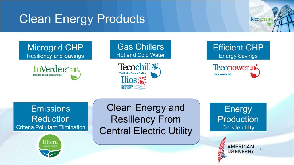 Tecogen Advanced Modular Energy Systems Heat, Power, and/or Cooling that is: Cheaper Industry leading efficiency and reduced exposure to expensive electricity Cleaner Proprietary near-zero emissions technology, GHG reductions More reliable Real-time monitoring, blackout protection, and improved grid resiliency All of Tecogen’s equipment is powered by efficient natural gas equipped with Tecogen’s patented Ultera Emission Control 5