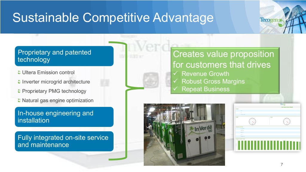 Clean Energy Products Microgrid CHP Gas Chillers Efficient CHP Resiliency and Savings Hot and Cold Water Energy Savings Emissions Clean Energy and Energy Reduction Resiliency From Production Criteria Pollutant Elimination Central Electric Utility On-site utility 6