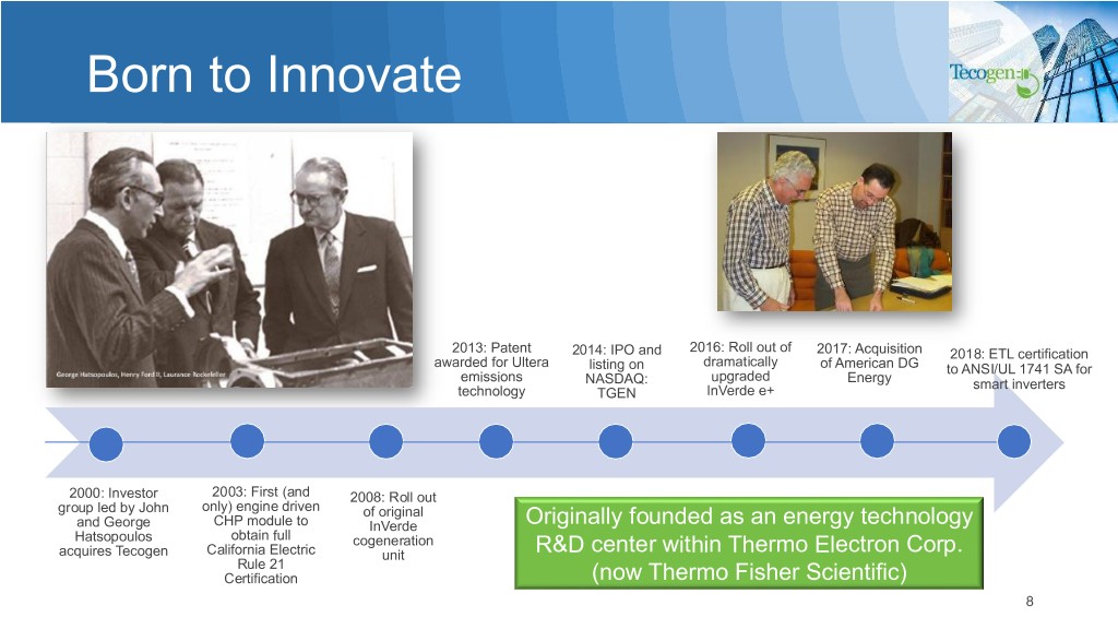 Born to Innovate 2013: Patent 2014: IPO and 2016: Roll out of 2017: Acquisition 2018: ETL certification dramatically awarded for Ultera listing on of American DG to ANSI/UL 1741 SA for emissions upgraded NASDAQ: Energy smart inverters technology TGEN InVerde e+ 2000: Investor 2003: First (and 2008: Roll out group led by John only) engine driven of original and George CHP module to InVerde Originally founded as an energy technology Hatsopoulos obtain full cogeneration acquires Tecogen California Electric unit R&D center within Thermo Electron Corp. Rule 21 Certification (now Thermo Fisher Scientific) 8