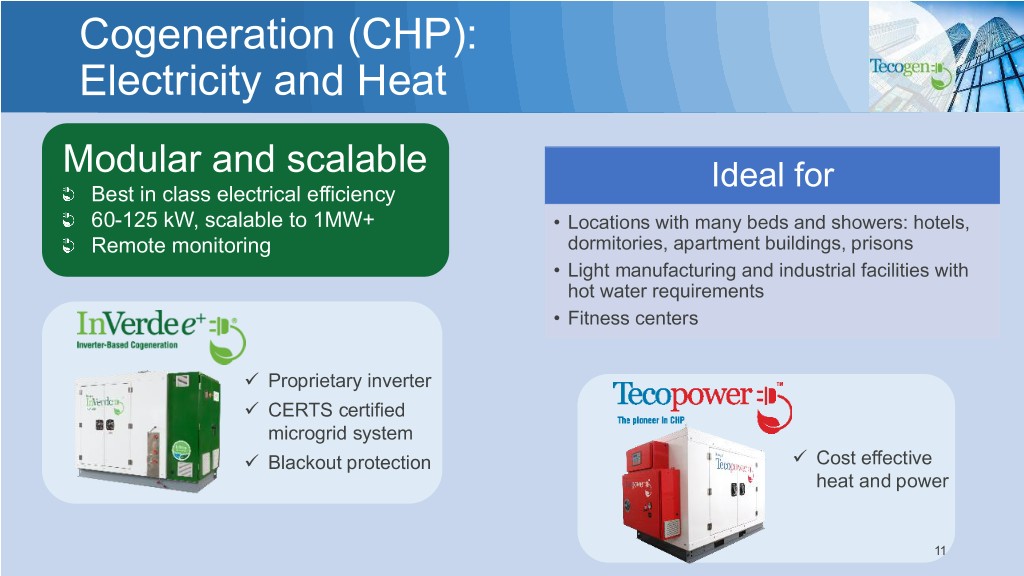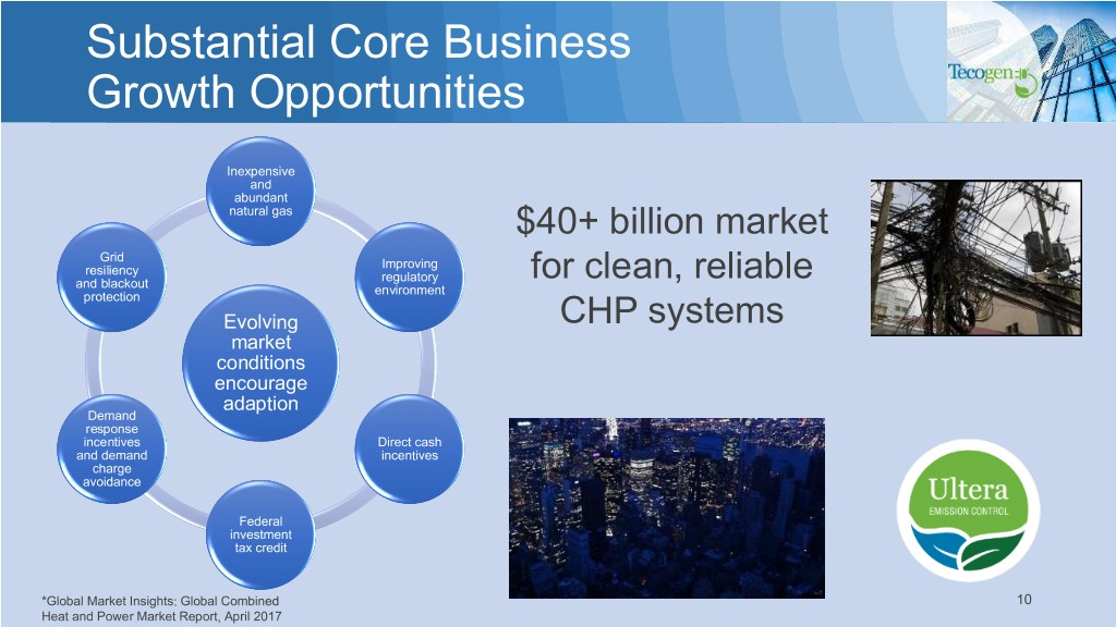 Substantial Core Business Growth Opportunities Inexpensive and abundant natural gas $40+ billion market Grid Improving resiliency regulatory and blackout for clean, reliable environment protection Evolving CHP systems market conditions encourage adaption Demand response incentives Direct cash and demand incentives charge avoidance Federal investment tax credit *Global Market Insights: Global Combined 10 Heat and Power Market Report, April 2017