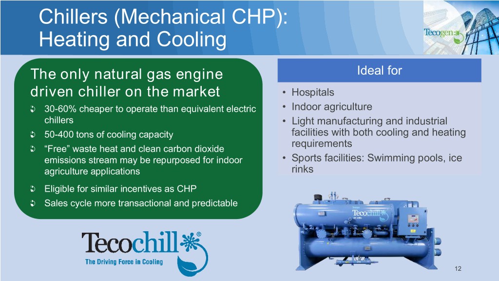 Cogeneration (CHP): Electricity and Heat Modular and scalable Ideal for Best in class electrical efficiency 60-125 kW, scalable to 1MW+ • Locations with many beds and showers: hotels, Remote monitoring dormitories, apartment buildings, prisons • Light manufacturing and industrial facilities with hot water requirements • Fitness centers ✓ Proprietary inverter ✓ CERTS certified microgrid system ✓ ✓ Blackout protection Cost effective heat and power 11