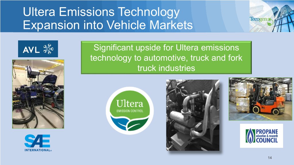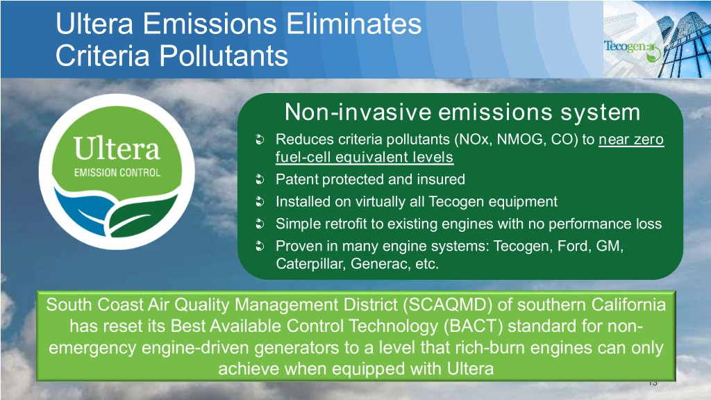 Ultera Emissions Eliminates Criteria Pollutants Non-invasive emissions system Reduces criteria pollutants (NOx, NMOG, CO) to near zero fuel-cell equivalent levels Patent protected and insured Installed on virtually all Tecogen equipment Simple retrofit to existing engines with no performance loss Proven in many engine systems: Tecogen, Ford, GM, Caterpillar, Generac, etc. South Coast Air Quality Management District (SCAQMD) of southern California has reset its Best Available Control Technology (BACT) standard for non- emergency engine-driven generators to a level that rich-burn engines can only achieve when equipped with Ultera 13