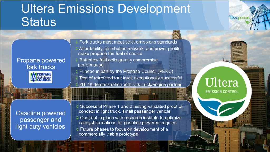Ultera Emissions Technology Expansion into Vehicle Markets Significant upside for Ultera emissions technology to automotive, truck and fork truck industries 14