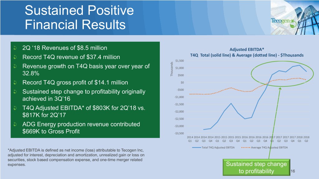 Sustained Positive Financial Results 2Q ‘18 Revenues of $8.5 million Adjusted EBITDA* Record T4Q revenue of $37.4 million T4Q Total (solid line) & Average (dotted line) - $Thousands $1,500 Revenue growth on T4Q basis year over year of $1,000 32.8% Thousands $500 Record T4Q gross profit of $14.1 million $0 Sustained step change to profitability originally -$500 achieved in 3Q’16 -$1,000 -$1,500 T4Q Adjusted EBITDA* of $803K for 2Q’18 vs. -$2,000 $817K for 2Q’17 -$2,500 ADG Energy production revenue contributed -$3,000 $669K to Gross Profit -$3,500 2014 2014 2014 2014 2015 2015 2015 2015 2016 2016 2016 2016 2017 2017 2017 2017 2018 2018 Q1 Q2 Q3 Q4 Q1 Q2 Q3 Q4 Q1 Q2 Q3 Q4 Q1 Q2 Q3 Q4 Q1 Q2 Total T4Q Adjusted EBITDA Average T4Q Adjusted EBITDA *Adjusted EBITDA is defined as net income (loss) attributable to Tecogen Inc, adjusted for interest, depreciation and amortization, unrealized gain or loss on securities, stock based compensation expense, and one-time merger related expenses. Sustained step change to profitability 16