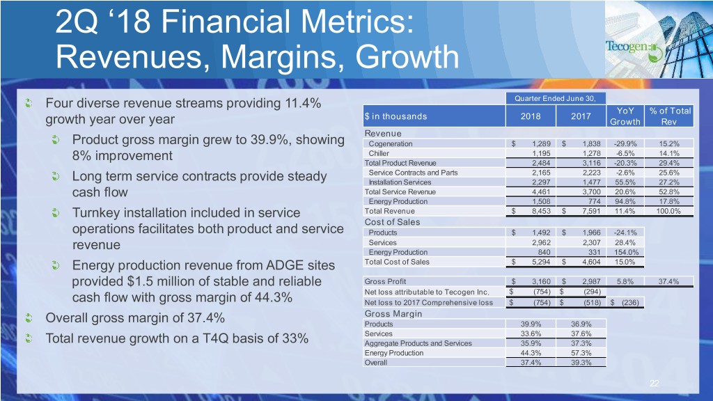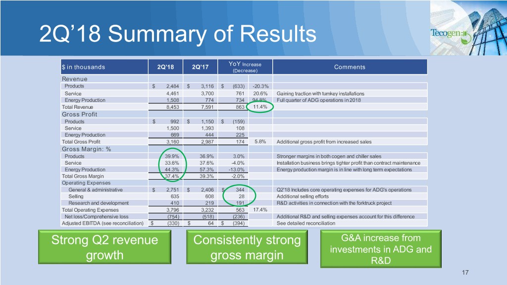 2Q’18 Summary of Results YoY Increase $ in thousands 2Q’18 2Q’17 Comments (Decrease) Revenue Products $ 2,484 $ 3,116 $ (633) -20.3% Service 4,461 3,700 761 20.6% Gaining traction with turnkey installations Energy Production 1,508 774 734 94.8% Full quarter of ADG operations in 2018 Total Revenue 8,453 7,591 863 11.4% Gross Profit Products $ 992 $ 1,150 $ (159) Service 1,500 1,393 108 Energy Production 669 444 225 Total Gross Profit 3,160 2,987 174 5.8% Additional gross profit from increased sales Gross Margin: % Products 39.9% 36.9% 3.0% Stronger margins in both cogen and chiller sales Service 33.6% 37.6% -4.0% Installation business brings tighter profit than contract maintenance Energy Production 44.3% 57.3% -13.0% Energy production margin is in line with long term expectations Total Gross Margin 37.4% 39.3% -2.0% Operating Expenses General & administrative $ 2,751 $ 2,406 $ 344 Q2'18 Includes core operating expenses for ADG's operations Selling 635 608 28 Additional selling efforts Research and development 410 219 191 R&D activities in connection with the forktruck project Total Operating Expenses 3,796 3,232 563 17.4% Net loss/Comprehensive loss (754) (518) (236) Additional R&D and selling expenses account for this difference Adjusted EBITDA (see reconciliation) $ (330) $ 64 $ (394) See detailed reconciliation Strong Q2 revenue Consistently strong G&A increase from investments in ADG and growth gross margin R&D 17