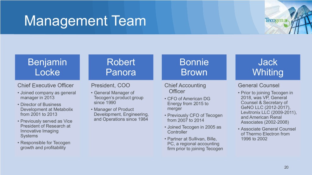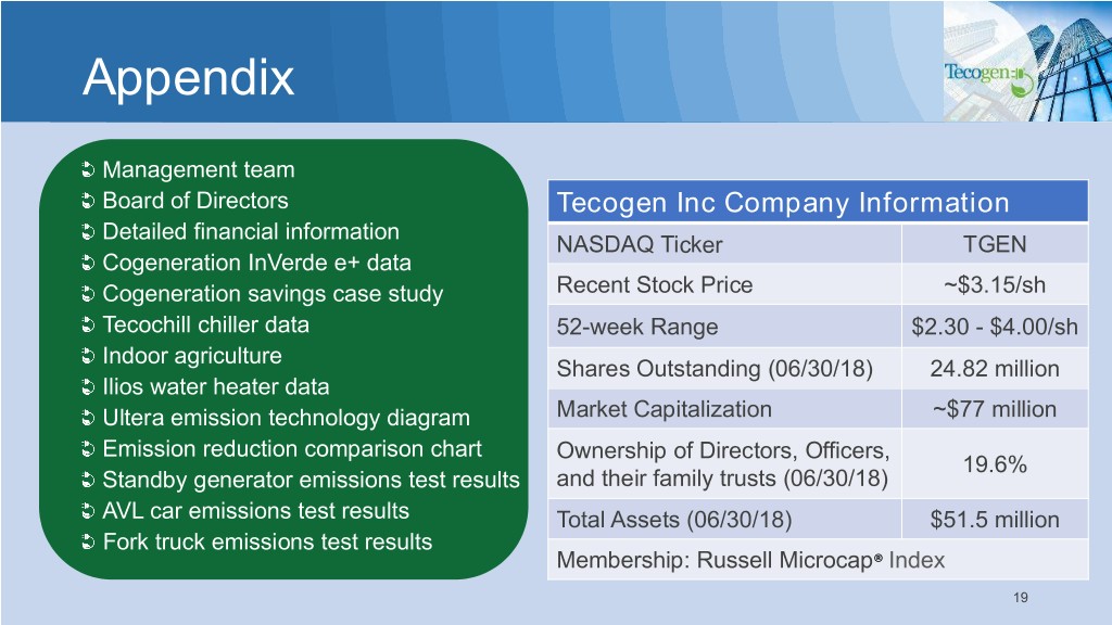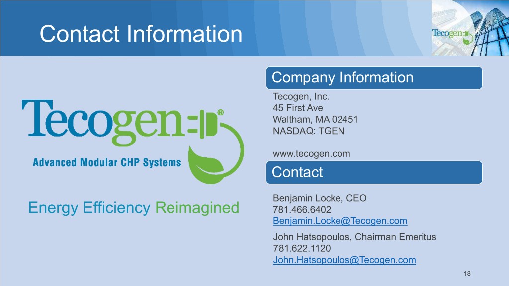 Contact Information Company Information Tecogen, Inc. 45 First Ave Waltham, MA 02451 NASDAQ: TGEN www.tecogen.com Contact Benjamin Locke, CEO Energy Efficiency Reimagined 781.466.6402 Benjamin.Locke@Tecogen.com John Hatsopoulos, Chairman Emeritus 781.622.1120 John.Hatsopoulos@Tecogen.com 18