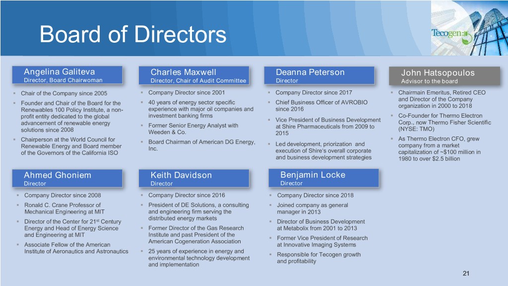 Management Team Benjamin Robert Bonnie Jack Locke Panora Brown Whiting Chief Executive Officer President, COO Chief Accounting General Counsel • Joined company as general • General Manager of Officer • Prior to joining Tecogen in manager in 2013 Tecogen’s product group • CFO of American DG 2018, was VP, General • Director of Business since 1990 Energy from 2015 to Counsel & Secretary of Development at Metabolix • Manager of Product merger GeNO LLC (2012-2017), Levitronix LLC (2009-2011), from 2001 to 2013 Development, Engineering, • Previously CFO of Tecogen and Operations since 1984 and American Renal • Previously served as Vice from 2007 to 2014 Associates (2002-2008) President of Research at • Joined Tecogen in 2005 as • Associate General Counsel Innovative Imaging Controller Systems of Thermo Electron from • Partner at Sullivan, Bille, 1996 to 2002 • Responsible for Tecogen PC, a regional accounting growth and profitability firm prior to joining Tecogen 20