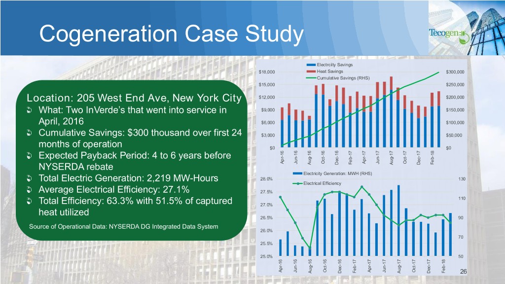 Cogeneration Case Study Electrciity Savings $18,000 Heat Savings $300,000 Cumulative Savings (RHS) $15,000 $250,000 Location: 205 West End Ave, New York City $12,000 $200,000 What: Two InVerde’s that went into service in $9,000 $150,000 April, 2016 $6,000 $100,000 Cumulative Savings: $300 thousand over first 24 $3,000 $50,000 months of operation $0 $0 Expected Payback Period: 4 to 6 years before Apr-16 Oct-16 Apr-17 Oct-17 Jun-17 Jun-16 Feb-17 Feb-18 Aug-16 Aug-17 Dec-17 NYSERDA rebate Dec-16 Electricity Generation: MWH (RHS) Total Electric Generation: 2,219 MW-Hours 28.0% 130 Electrical Efficiency Average Electrical Efficiency: 27.1% 27.5% 110 Total Efficiency: 63.3% with 51.5% of captured 27.0% heat utilized 26.5% 90 Source of Operational Data: NYSERDA DG Integrated Data System 26.0% 70 25.5% 25.0% 50 Apr-16 Oct-16 Apr-17 Oct-17 Jun-16 Jun-17 Feb-17 Feb-18 Dec-16 Dec-17 Aug-16 Aug-17 26