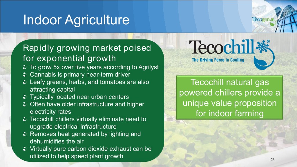 Indoor Agriculture Rapidly growing market poised for exponential growth To grow 5x over five years according to Agrilyst Cannabis is primary near-term driver Leafy greens, herbs, and tomatoes are also Tecochill natural gas attracting capital Typically located near urban centers powered chillers provide a Often have older infrastructure and higher unique value proposition electricity rates for indoor farming Tecochill chillers virtually eliminate need to upgrade electrical infrastructure Removes heat generated by lighting and dehumidifies the air Virtually pure carbon dioxide exhaust can be utilized to help speed plant growth 28