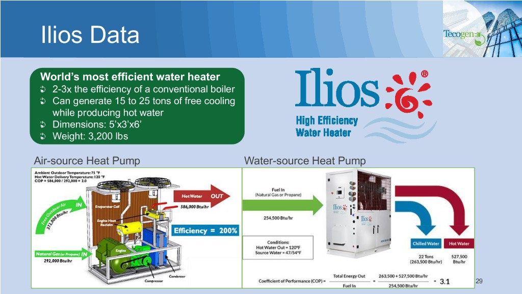 Ilios Data World’s most efficient water heater 2-3x the efficiency of a conventional boiler Can generate 15 to 25 tons of free cooling while producing hot water Dimensions: 5’x3’x6’ Weight: 3,200 lbs Air-source Heat Pump Water-source Heat Pump 29