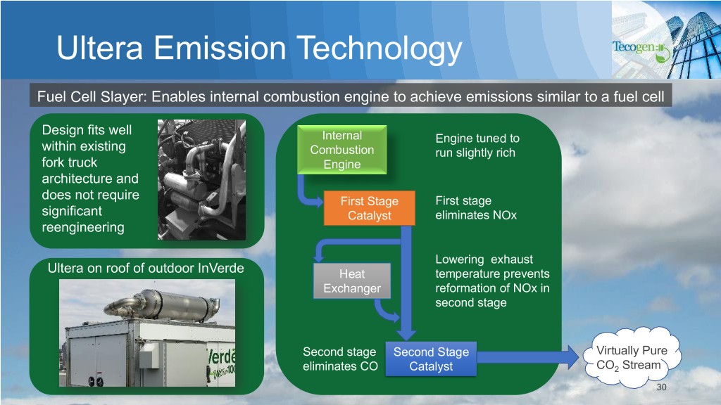 Ultera Emission Technology Fuel Cell Slayer: Enables internal combustion engine to achieve emissions similar to a fuel cell Design fits well Internal Engine tuned to within existing Combustion run slightly rich fork truck Engine architecture and does not require First Stage First stage significant Catalyst eliminates NOx reengineering Lowering exhaust Ultera on roof of outdoor InVerde Heat temperature prevents Exchanger reformation of NOx in second stage Second stage Second Stage Virtually Pure eliminates CO Catalyst CO2 Stream 30