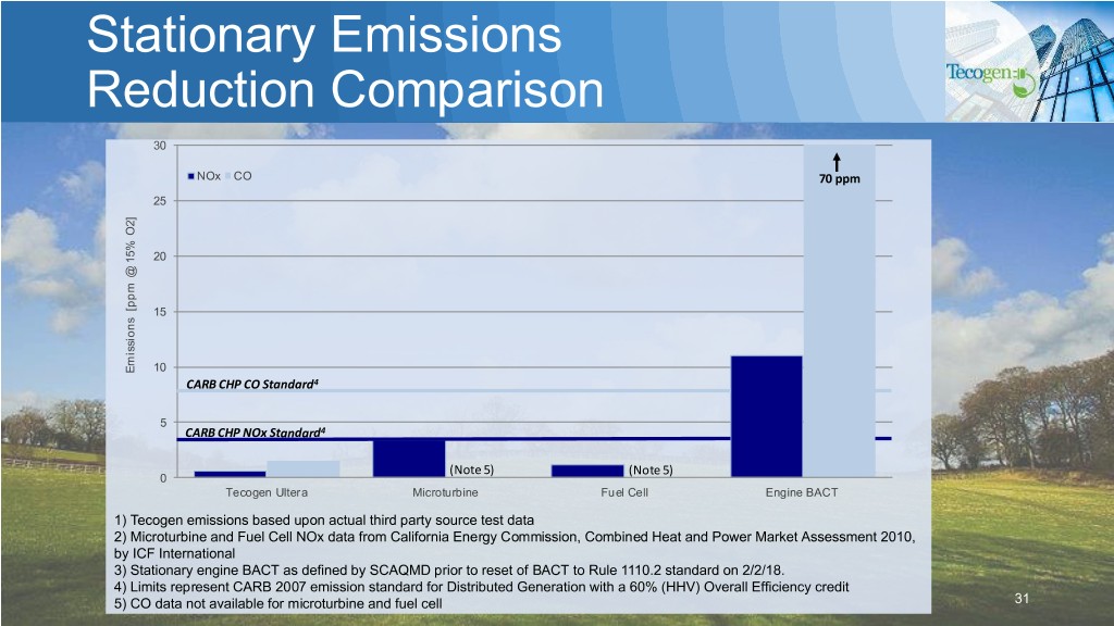 Stationary Emissions Reduction Comparison 30 NOx CO 70 ppm 25 20 15 Emissions Emissions [ppm 15% @ O2] 10 CARB CHP CO Standard4 5 CARB CHP NOx Standard4 (Note 5) (Note 5) 0 Tecogen Ultera Microturbine Fuel Cell Engine BACT 1) Tecogen emissions based upon actual third party source test data 2) Microturbine and Fuel Cell NOx data from California Energy Commission, Combined Heat and Power Market Assessment 2010, by ICF International 3) Stationary engine BACT as defined by SCAQMD prior to reset of BACT to Rule 1110.2 standard on 2/2/18. 4) Limits represent CARB 2007 emission standard for Distributed Generation with a 60% (HHV) Overall Efficiency credit 5) CO data not available for microturbine and fuel cell 31