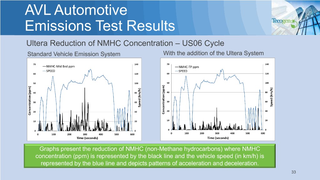 AVL Automotive Emissions Test Results Ultera Reduction of CO Concentration – US06 Cycle Standard Vehicle Emission System With the addition of the Ultera System Graphs present the reduction of measured CO concentration where CO concentration (ppm) is represented by the red line and the vehicle speed (in km/h) is represented by the blue line and depicts patterns of acceleration and deceleration. CO is nearly eliminated by the Ultera System 32