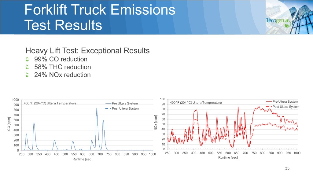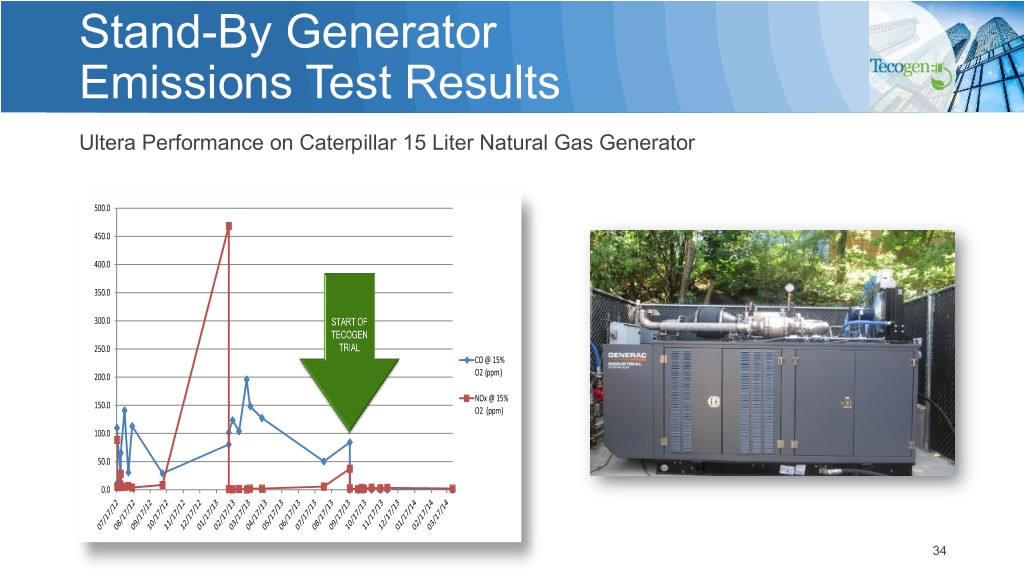 Stand-By Generator Emissions Test Results Ultera Performance on Caterpillar 15 Liter Natural Gas Generator 500.0 450.0 400.0 350.0 300.0 250.0 CO @ 15% 200.0 O2 (ppm) NOx @ 15% 150.0 O2 (ppm) 100.0 50.0 0.0 34