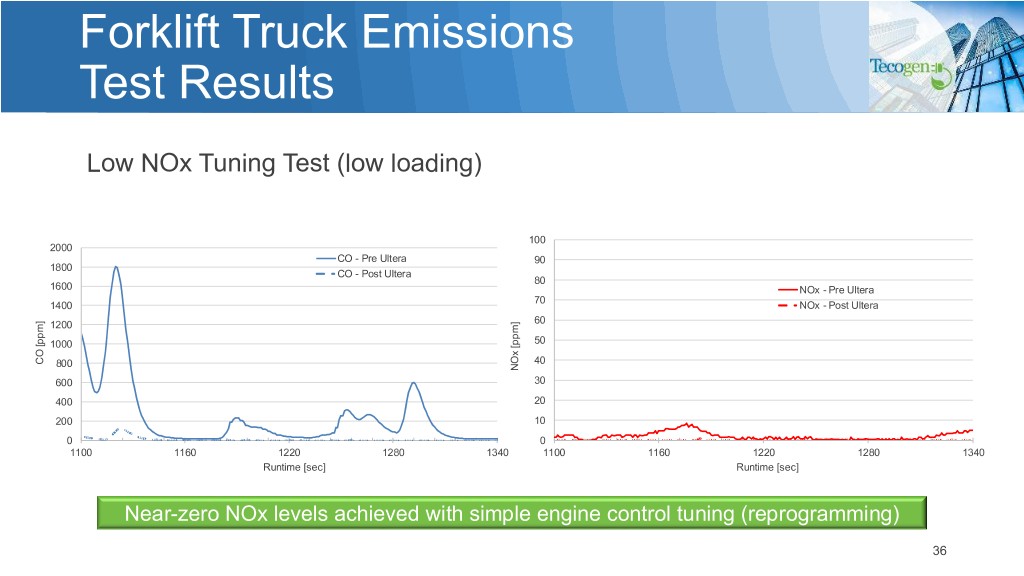 Forklift Truck Emissions Test Results Low NOx Tuning Test (low loading) 100 2000 CO - Pre Ultera 90 1800 CO - Post Ultera 80 1600 NOx - Pre Ultera 70 1400 NOx - Post Ultera 1200 60 1000 50 CO [ppm] CO 800 40 NOx [ppm]NOx 600 30 400 20 200 10 0 0 1100 1160 1220 1280 1340 1100 1160 1220 1280 1340 Runtime [sec] Runtime [sec] Near-zero NOx levels achieved with simple engine control tuning (reprogramming) 36