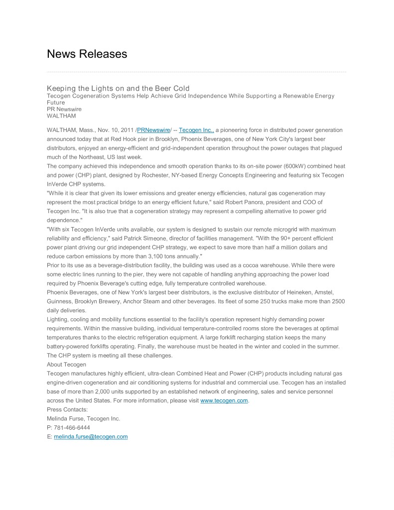 News Releases Keeping the Lights on and the Beer Cold Tecogen Cogeneration Systems Help Achieve Grid Independence While Supporting a Renewable Energy Future PR Newswire WALTHAM WALTHAM, Mass., Nov. 10, 2011 /PRNewswire/ -- Tecogen Inc., a pioneering force in distributed power generation announced today that at Red Hook pier in Brooklyn, Phoenix Beverages, one of New York City's largest beer distributors, enjoyed an energy-efficient and grid-independent operation throughout the power outages that plagued much of the Northeast, US last week. The company achieved this independence and smooth operation thanks to its on-site power (600kW) combined heat and power (CHP) plant, designed by Rochester, NY-based Energy Concepts Engineering and featuring six Tecogen InVerde CHP systems. "While it is clear that given its lower emissions and greater energy efficiencies, natural gas cogeneration may represent the most practical bridge to an energy efficient future," said Robert Panora, president and COO of Tecogen Inc. "It is also true that a cogeneration strategy may represent a compelling alternative to power grid dependence." "With six Tecogen InVerde units available, our system is designed to sustain our remote microgrid with maximum reliability and efficiency," said Patrick Simeone, director of facilities management. "With the 90+ percent efficient power plant driving our grid independent CHP strategy, we expect to save more than half a million dollars and reduce carbon emissions by more than 3,100 tons annually." Prior to its use as a beverage-distribution facility, the building was used as a cocoa warehouse. While there were some electric lines running to the pier, they were not capable of handling anything approaching the power load required by Phoenix Beverage's cutting edge, fully temperature controlled warehouse. Phoenix Beverages, one of New York's largest beer distributors, is the exclusive distributor of Heineken, Amstel, Guinness, Brooklyn Brewery, Anchor Steam and other beverages. Its fleet of some 250 trucks make more than 2500 daily deliveries. Lighting, cooling and mobility functions essential to the facility's operation represent highly demanding power requirements. Within the massive building, individual temperature-controlled rooms store the beverages at optimal temperatures thanks to the electric refrigeration equipment. A large forklift recharging station keeps the many battery-powered forklifts operating. Finally, the warehouse must be heated in the winter and cooled in the summer. The CHP system is meeting all these challenges. About Tecogen Tecogen manufactures highly efficient, ultra-clean Combined Heat and Power (CHP) products including natural gas engine-driven cogeneration and air conditioning systems for industrial and commercial use. Tecogen has an installed base of more than 2,000 units supported by an established network of engineering, sales and service personnel across the United States. For more information, please visit www.tecogen.com. Press Contacts: Melinda Furse, Tecogen Inc. P: 781-466-6444 E: melinda.furse@tecogen.com
