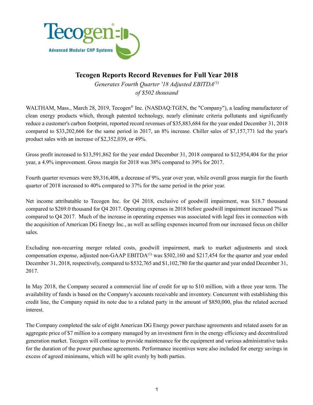 Tecogen Reports Record Revenues for Full Year 2018 Generates Fourth Quarter '18 Adjusted EBITDA(1) of $502 thousand WALTHAM, Mass., March 28, 2019, Tecogen® Inc. (NASDAQ:TGEN, the "Company"), a leading manufacturer of clean energy products which, through patented technology, nearly eliminate criteria pollutants and significantly reduce a customer's carbon footprint, reported record revenues of $35,883,684 for the year ended December 31, 2018 compared to $33,202,666 for the same period in 2017, an 8% increase. Chiller sales of $7,157,771 led the year's product sales with an increase of $2,352,039, or 49%. Gross profit increased to $13,591,862 for the year ended December 31, 2018 compared to $12,954,404 for the prior year, a 4.9% improvement. Gross margin for 2018 was 38% compared to 39% for 2017. Fourth quarter revenues were $9,316,408, a decrease of 9%, year over year, while overall gross margin for the fourth quarter of 2018 increased to 40% compared to 37% for the same period in the prior year. Net income attributable to Tecogen Inc. for Q4 2018, exclusive of goodwill impairment, was $18.7 thousand compared to $269.0 thousand for Q4 2017. Operating expenses in 2018 before goodwill impairment increased 7% as compared to Q4 2017. Much of the increase in operating expenses was associated with legal fees in connection with the acquisition of American DG Energy Inc., as well as selling expenses incurred from our increased focus on chiller sales. Excluding non-recurring merger related costs, goodwill impairment, mark to market adjustments and stock compensation expense, adjusted non-GAAP EBITDA(1) was $502,160 and $217,454 for the quarter and year ended December 31, 2018, respectively, compared to $532,765 and $1,102,780 for the quarter and year ended December 31, 2017. In May 2018, the Company secured a commercial line of credit for up to $10 million, with a three year term. The availability of funds is based on the Company's accounts receivable and inventory. Concurrent with establishing this credit line, the Company repaid its note due to a related party in the amount of $850,000, plus the related accrued interest. The Company completed the sale of eight American DG Energy power purchase agreements and related assets for an aggregate price of $7 million to a company managed by an investment firm in the energy efficiency and decentralized generation market. Tecogen will continue to provide maintenance for the equipment and various administrative tasks for the duration of the power purchase agreements. Performance incentives were also included for energy savings in excess of agreed minimums, which will be split evenly by both parties. 1
