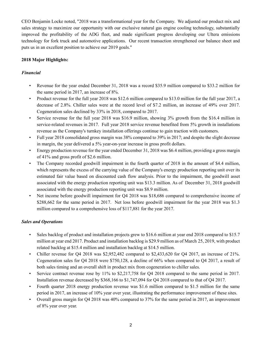CEO Benjamin Locke noted, "2018 was a transformational year for the Company. We adjusted our product mix and sales strategy to maximize our opportunity with our exclusive natural gas engine cooling technology, substantially improved the profitability of the ADG fleet, and made significant progress developing our Ultera emissions technology for fork truck and automotive applications. Our recent transaction strengthened our balance sheet and puts us in an excellent position to achieve our 2019 goals." 2018 Major Highlights: Financial • Revenue for the year ended December 31, 2018 was a record $35.9 million compared to $33.2 million for the same period in 2017, an increase of 8%. • Product revenue for the full year 2018 was $12.6 million compared to $13.0 million for the full year 2017, a decrease of 2.8%. Chiller sales were at the record level of $7.2 million, an increase of 49% over 2017. Cogeneration sales declined by 33% in 2018, compared to 2017. • Service revenue for the full year 2018 was $16.9 million, showing 3% growth from the $16.4 million in service-related revenues in 2017. Full year 2018 service revenue benefited from 5% growth in installations revenue as the Company's turnkey installation offerings continue to gain traction with customers. • Full year 2018 consolidated gross margin was 38% compared to 39% in 2017; and despite the slight decrease in margin, the year delivered a 5% year-on-year increase in gross profit dollars. • Energy production revenue for the year ended December 31, 2018 was $6.4 million, providing a gross margin of 41% and gross profit of $2.6 million. • The Company recorded goodwill impairment in the fourth quarter of 2018 in the amount of $4.4 million, which represents the excess of the carrying value of the Company's energy production reporting unit over its estimated fair value based on discounted cash flow analysis. Prior to the impairment, the goodwill asset associated with the energy production reporting unit was $13.3 million. As of December 31, 2018 goodwill associated with the energy production reporting unit was $8.9 million. • Net income before goodwill impairment for Q4 2018 was $18,686 compared to comprehensive income of $288,662 for the same period in 2017. Net loss before goodwill impairment for the year 2018 was $1.3 million compared to a comprehensive loss of $117,881 for the year 2017. Sales and Operations • Sales backlog of product and installation projects grew to $16.6 million at year end 2018 compared to $15.7 million at year end 2017. Product and installation backlog is $29.9 million as of March 25, 2019, with product related backlog at $15.4 million and installation backlog at $14.5 million. • Chiller revenue for Q4 2018 was $2,952,482 compared to $2,433,620 for Q4 2017, an increase of 21%. Cogeneration sales for Q4 2018 were $750,128, a decline of 66% when compared to Q4 2017, a result of both sales timing and an overall shift in product mix from cogeneration to chiller sales. • Service contract revenue rose by 11% to $2,217,758 for Q4 2018 compared to the same period in 2017. Installation revenue decreased by $368,166 to $1,747,094 for Q4 2018 compared to that of Q4 2017. • Fourth quarter 2018 energy production revenue was $1.6 million compared to $1.5 million for the same period in 2017, an increase of 10% year over year, illustrating the performance improvement of these sites. • Overall gross margin for Q4 2018 was 40% compared to 37% for the same period in 2017, an improvement of 8% year over year. 2