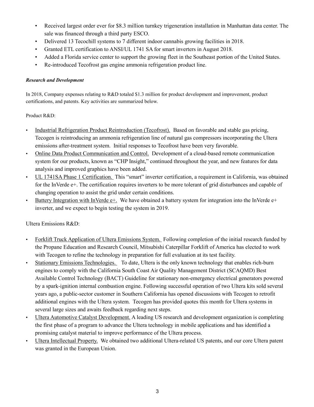 • Received largest order ever for $8.3 million turnkey trigeneration installation in Manhattan data center. The sale was financed through a third party ESCO. • Delivered 13 Tecochill systems to 7 different indoor cannabis growing facilities in 2018. • Granted ETL certification to ANSI/UL 1741 SA for smart inverters in August 2018. • Added a Florida service center to support the growing fleet in the Southeast portion of the United States. • Re-introduced Tecofrost gas engine ammonia refrigeration product line. Research and Development In 2018, Company expenses relating to R&D totaled $1.3 million for product development and improvement, product certifications, and patents. Key activities are summarized below. Product R&D: • Industrial Refrigeration Product Reintroduction (Tecofrost). Based on favorable and stable gas pricing, Tecogen is reintroducing an ammonia refrigeration line of natural gas compressors incorporating the Ultera emissions after-treatment system. Initial responses to Tecofrost have been very favorable. • Online Data Product Communication and Control. Development of a cloud-based remote communication system for our products, known as “CHP Insight,” continued throughout the year, and new features for data analysis and improved graphics have been added. • UL 1741SA Phase 1 Certification. This “smart” inverter certification, a requirement in California, was obtained for the InVerde e+. The certification requires inverters to be more tolerant of grid disturbances and capable of changing operation to assist the grid under certain conditions. • Battery Integration with InVerde e+. We have obtained a battery system for integration into the InVerde e+ inverter, and we expect to begin testing the system in 2019. Ultera Emissions R&D: • Forklift Truck Application of Ultera Emissions System. Following completion of the initial research funded by the Propane Education and Research Council, Mitsubishi Caterpillar Forklift of America has elected to work with Tecogen to refine the technology in preparation for full evaluation at its test facility. • Stationary Emissions Technologies. To date, Ultera is the only known technology that enables rich-burn engines to comply with the California South Coast Air Quality Management District (SCAQMD) Best Available Control Technology (BACT) Guideline for stationary non-emergency electrical generators powered by a spark-ignition internal combustion engine. Following successful operation of two Ultera kits sold several years ago, a public-sector customer in Southern California has opened discussions with Tecogen to retrofit additional engines with the Ultera system. Tecogen has provided quotes this month for Ultera systems in several large sizes and awaits feedback regarding next steps. • Ultera Automotive Catalyst Development. A leading US research and development organization is completing the first phase of a program to advance the Ultera technology in mobile applications and has identified a promising catalyst material to improve performance of the Ultera process. • Ultera Intellectual Property. We obtained two additional Ultera-related US patents, and our core Ultera patent was granted in the European Union. 3