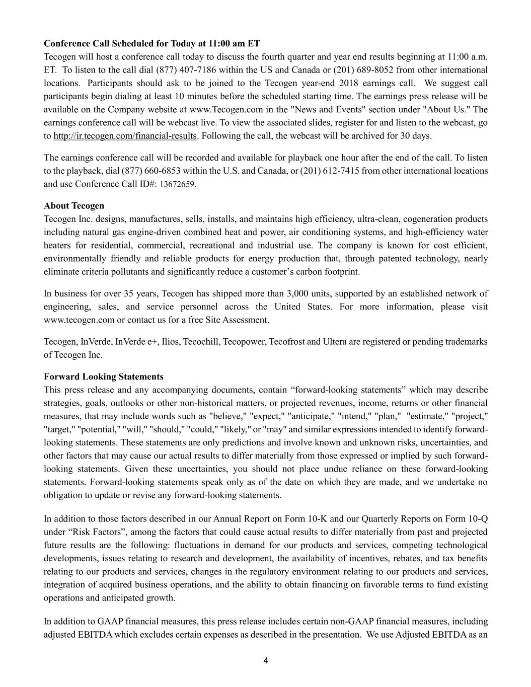 Conference Call Scheduled for Today at 11:00 am ET Tecogen will host a conference call today to discuss the fourth quarter and year end results beginning at 11:00 a.m. ET. To listen to the call dial (877) 407-7186 within the US and Canada or (201) 689-8052 from other international locations. Participants should ask to be joined to the Tecogen year-end 2018 earnings call. We suggest call participants begin dialing at least 10 minutes before the scheduled starting time. The earnings press release will be available on the Company website at www.Tecogen.com in the "News and Events" section under "About Us." The earnings conference call will be webcast live. To view the associated slides, register for and listen to the webcast, go to http://ir.tecogen.com/financial-results. Following the call, the webcast will be archived for 30 days. The earnings conference call will be recorded and available for playback one hour after the end of the call. To listen to the playback, dial (877) 660-6853 within the U.S. and Canada, or (201) 612-7415 from other international locations and use Conference Call ID#: 13672659. About Tecogen Tecogen Inc. designs, manufactures, sells, installs, and maintains high efficiency, ultra-clean, cogeneration products including natural gas engine-driven combined heat and power, air conditioning systems, and high-efficiency water heaters for residential, commercial, recreational and industrial use. The company is known for cost efficient, environmentally friendly and reliable products for energy production that, through patented technology, nearly eliminate criteria pollutants and significantly reduce a customer’s carbon footprint. In business for over 35 years, Tecogen has shipped more than 3,000 units, supported by an established network of engineering, sales, and service personnel across the United States. For more information, please visit www.tecogen.com or contact us for a free Site Assessment. Tecogen, InVerde, InVerde e+, Ilios, Tecochill, Tecopower, Tecofrost and Ultera are registered or pending trademarks of Tecogen Inc. Forward Looking Statements This press release and any accompanying documents, contain “forward-looking statements” which may describe strategies, goals, outlooks or other non-historical matters, or projected revenues, income, returns or other financial measures, that may include words such as "believe," "expect," "anticipate," "intend," "plan," "estimate," "project," "target," "potential," "will," "should," "could," "likely," or "may" and similar expressions intended to identify forward- looking statements. These statements are only predictions and involve known and unknown risks, uncertainties, and other factors that may cause our actual results to differ materially from those expressed or implied by such forward- looking statements. Given these uncertainties, you should not place undue reliance on these forward-looking statements. Forward-looking statements speak only as of the date on which they are made, and we undertake no obligation to update or revise any forward-looking statements. In addition to those factors described in our Annual Report on Form 10-K and our Quarterly Reports on Form 10-Q under “Risk Factors”, among the factors that could cause actual results to differ materially from past and projected future results are the following: fluctuations in demand for our products and services, competing technological developments, issues relating to research and development, the availability of incentives, rebates, and tax benefits relating to our products and services, changes in the regulatory environment relating to our products and services, integration of acquired business operations, and the ability to obtain financing on favorable terms to fund existing operations and anticipated growth. In addition to GAAP financial measures, this press release includes certain non-GAAP financial measures, including adjusted EBITDA which excludes certain expenses as described in the presentation. We use Adjusted EBITDA as an 4
