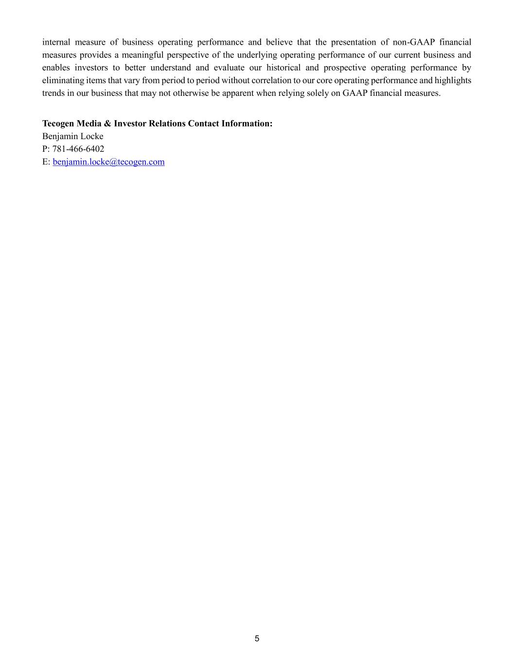 internal measure of business operating performance and believe that the presentation of non-GAAP financial measures provides a meaningful perspective of the underlying operating performance of our current business and enables investors to better understand and evaluate our historical and prospective operating performance by eliminating items that vary from period to period without correlation to our core operating performance and highlights trends in our business that may not otherwise be apparent when relying solely on GAAP financial measures. Tecogen Media & Investor Relations Contact Information: Benjamin Locke P: 781-466-6402 E: benjamin.locke@tecogen.com 5