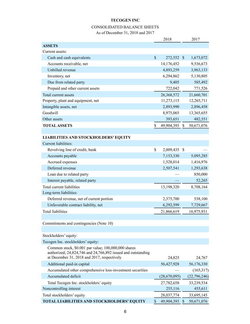 TECOGEN INC CONSOLIDATED BALANCE SHEETS As of December 31, 2018 and 2017 2018 2017 ASSETS Current assets: Cash and cash equivalents $ 272,552 $ 1,673,072 Accounts receivable, net 14,176,452 9,536,673 Unbilled revenue 4,893,259 3,963,133 Inventory, net 6,294,862 5,130,805 Due from related party 9,405 585,492 Prepaid and other current assets 722,042 771,526 Total current assets 26,368,572 21,660,701 Property, plant and equipment, net 11,273,115 12,265,711 Intangible assets, net 2,893,990 2,896,458 Goodwill 8,975,065 13,365,655 Other assets 393,651 482,551 TOTAL ASSETS $ 49,904,393 $ 50,671,076 LIABILITIES AND STOCKHOLDERS’ EQUITY Current liabilities: Revolving line of credit, bank $ 2,009,435 $ — Accounts payable 7,153,330 5,095,285 Accrued expenses 1,528,014 1,416,976 Deferred revenue 2,507,541 1,293,638 Loan due to related party — 850,000 Interest payable, related party — 52,265 Total current liabilities 13,198,320 8,708,164 Long-term liabilities: Deferred revenue, net of current portion 2,375,700 538,100 Unfavorable contract liability, net 6,292,599 7,729,667 Total liabilities 21,866,619 16,975,931 Commitments and contingencies (Note 10) Stockholders’ equity: Tecogen Inc. stockholders’ equity: Common stock, $0.001 par value; 100,000,000 shares authorized; 24,824,746 and 24,766,892 issued and outstanding at December 31, 2018 and 2017, respectively 24,825 24,767 Additional paid-in capital 56,427,928 56,176,330 Accumulated other comprehensive loss-investment securities — (165,317) Accumulated deficit (28,670,095) (22,796,246) Total Tecogen Inc. stockholders’ equity 27,782,658 33,239,534 Noncontrolling interest 255,116 455,611 Total stockholders’ equity 28,037,774 33,695,145 TOTAL LIABILITIES AND STOCKHOLDERS’ EQUITY $ 49,904,393 $ 50,671,076 6