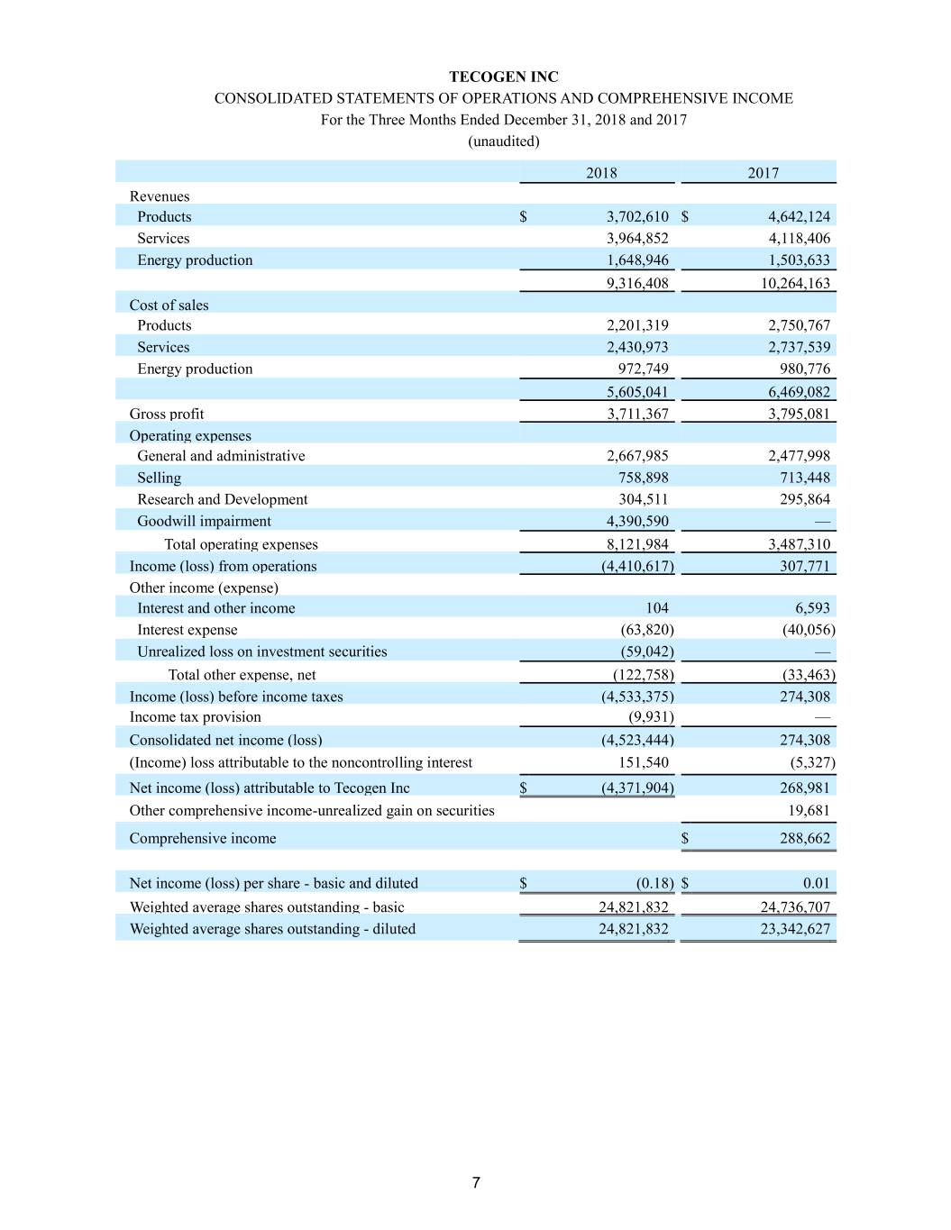 TECOGEN INC CONSOLIDATED STATEMENTS OF OPERATIONS AND COMPREHENSIVE INCOME For the Three Months Ended December 31, 2018 and 2017 (unaudited) 2018 2017 Revenues Products $ 3,702,610 $ 4,642,124 Services 3,964,852 4,118,406 Energy production 1,648,946 1,503,633 9,316,408 10,264,163 Cost of sales Products 2,201,319 2,750,767 Services 2,430,973 2,737,539 Energy production 972,749 980,776 5,605,041 6,469,082 Gross profit 3,711,367 3,795,081 Operating expenses General and administrative 2,667,985 2,477,998 Selling 758,898 713,448 Research and Development 304,511 295,864 Goodwill impairment 4,390,590 — Total operating expenses 8,121,984 3,487,310 Income (loss) from operations (4,410,617 ) 307,771 Other income (expense) Interest and other income 104 6,593 Interest expense (63,820 ) (40,056 ) Unrealized loss on investment securities (59,042 ) — Total other expense, net (122,758 ) (33,463 ) Income (loss) before income taxes (4,533,375 ) 274,308 Income tax provision (9,931 ) — Consolidated net income (loss) (4,523,444 ) 274,308 (Income) loss attributable to the noncontrolling interest 151,540 (5,327 ) Net income (loss) attributable to Tecogen Inc $ (4,371,904 ) 268,981 Other comprehensive income-unrealized gain on securities 19,681 Comprehensive income $ 288,662 Net income (loss) per share - basic and diluted $ (0.18 ) $ 0.01 Weighted average shares outstanding - basic 24,821,832 24,736,707 Weighted average shares outstanding - diluted 24,821,832 23,342,627 7
