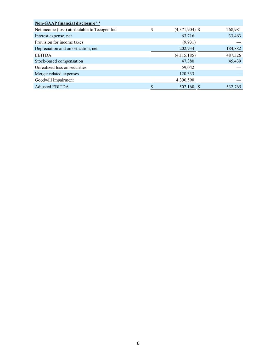 Non-GAAP financial disclosure (1) Net income (loss) attributable to Tecogen Inc $ (4,371,904 ) $ 268,981 Interest expense, net 63,716 33,463 Provision for income taxes (9,931 ) — Depreciation and amortization, net 202,934 184,882 EBITDA (4,115,185 ) 487,326 Stock-based compensation 47,380 45,439 Unrealized loss on securities 59,042 — Merger related expenses 120,333 — Goodwill impairment 4,390,590 — Adjusted EBITDA $ 502,160 $ 532,765 8