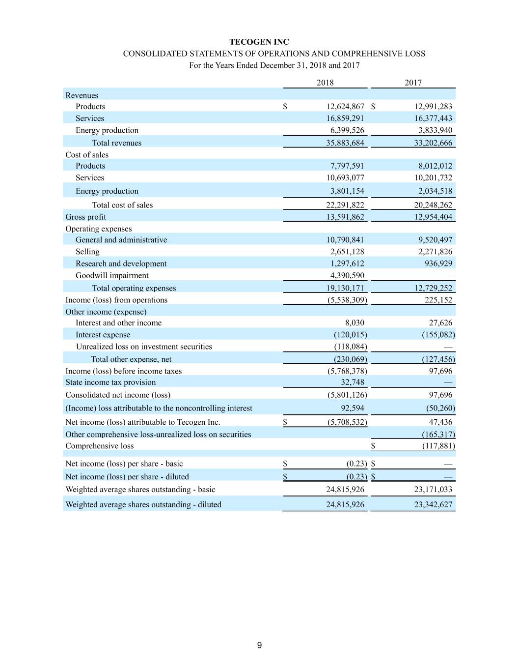 TECOGEN INC CONSOLIDATED STATEMENTS OF OPERATIONS AND COMPREHENSIVE LOSS For the Years Ended December 31, 2018 and 2017 2018 2017 Revenues Products $ 12,624,867 $ 12,991,283 Services 16,859,291 16,377,443 Energy production 6,399,526 3,833,940 Total revenues 35,883,684 33,202,666 Cost of sales Products 7,797,591 8,012,012 Services 10,693,077 10,201,732 Energy production 3,801,154 2,034,518 Total cost of sales 22,291,822 20,248,262 Gross profit 13,591,862 12,954,404 Operating expenses General and administrative 10,790,841 9,520,497 Selling 2,651,128 2,271,826 Research and development 1,297,612 936,929 Goodwill impairment 4,390,590 — Total operating expenses 19,130,171 12,729,252 Income (loss) from operations (5,538,309 ) 225,152 Other income (expense) Interest and other income 8,030 27,626 Interest expense (120,015 ) (155,082 ) Unrealized loss on investment securities (118,084 ) — Total other expense, net (230,069 ) (127,456 ) Income (loss) before income taxes (5,768,378 ) 97,696 State income tax provision 32,748 — Consolidated net income (loss) (5,801,126 ) 97,696 (Income) loss attributable to the noncontrolling interest 92,594 (50,260 ) Net income (loss) attributable to Tecogen Inc. $ (5,708,532 ) 47,436 Other comprehensive loss-unrealized loss on securities (165,317 ) Comprehensive loss $ (117,881 ) Net income (loss) per share - basic $ (0.23 ) $ — Net income (loss) per share - diluted $ (0.23 ) $ — Weighted average shares outstanding - basic 24,815,926 23,171,033 Weighted average shares outstanding - diluted 24,815,926 23,342,627 9