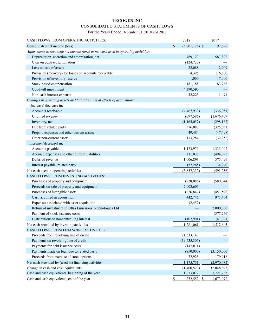 TECOGEN INC CONSOLIDATED STATEMENTS OF CASH FLOWS For the Years Ended December 31, 2018 and 2017 CASH FLOWS FROM OPERATING ACTIVITIES: 2018 2017 Consolidated net income (loss) $ (5,801,126) $ 97,696 Adjustments to reconcile net income (loss) to net cash used in operating activities: Depreciation, accretion and amortization, net 789,123 587,822 Gain on contract termination (124,733) — Loss on sale of assets 22,088 2,909 Provision (recovery) for losses on accounts receivable 4,395 (16,600) Provision of inventory reserve 1,000 17,000 Stock-based compensation 181,188 183,768 Goodwill impairment 4,390,590 — Non-cash interest expense 32,225 1,491 Changes in operating assets and liabilities, net of effects of acquisition: (Increase) decrease in: Accounts receivable (4,467,939) (336,051) Unbilled revenue (697,586) (1,676,409) Inventory, net (1,165,057) (298,167) Due from related party 576,087 (325,651) Prepaid expenses and other current assets 49,484 (47,498) Other non-current assets 113,284 (32,252) Increase (decrease) in: Accounts payable 1,173,979 1,335,042 Accrued expenses and other current liabilities 111,038 (494,095) Deferred revenue 1,006,893 375,499 Interest payable, related party (52,265) 34,240 Net cash used in operating activities (3,857,332) (591,256) CASH FLOWS FROM INVESTING ACTIVITIES: Purchases of property and equipment (828,086) (580,044) Proceeds on sale of property and equipment 2,003,606 — Purchases of intangible assets (226,847) (453,598) Cash acquired in acquisition 442,746 971,454 Expenses associated with asset acquisition (2,457) — Return of investment in Ultra Emissions Technologies Ltd — 2,000,000 Payment of stock issuance costs — (377,246) Distributions to noncontrolling interest (107,901) (47,921) Net cash provided by investing activities 1,281,061 1,512,645 CASH FLOWS FROM FINANCING ACTIVITIES: Proceeds from revolving line of credit 21,533,143 — Payments on revolving line of credit (19,435,306) — Payments for debt issuance costs (145,011) — Payments made on loan due to related party (850,000) (3,150,000) Proceeds from exercise of stock options 72,925 179,918 Net cash provided by (used in) financing activities 1,175,751 (2,970,082) Change in cash and cash equivalents (1,400,520) (2,048,693) Cash and cash equivalents, beginning of the year 1,673,072 3,721,765 Cash and cash equivalents, end of the year $ 272,552 $ 1,673,072 11