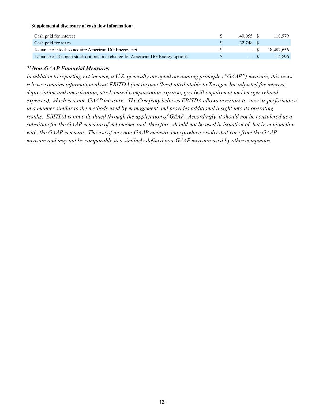Supplemental disclosure of cash flow information: Cash paid for interest $ 140,055 $ 110,979 Cash paid for taxes $ 32,748 $ — Issuance of stock to acquire American DG Energy, net $ — $ 18,482,656 Issuance of Tecogen stock options in exchange for American DG Energy options $ — $ 114,896 (1) Non-GAAP Financial Measures In addition to reporting net income, a U.S. generally accepted accounting principle (“GAAP”) measure, this news release contains information about EBITDA (net income (loss) attributable to Tecogen Inc adjusted for interest, depreciation and amortization, stock-based compensation expense, goodwill impairment and merger related expenses), which is a non-GAAP measure. The Company believes EBITDA allows investors to view its performance in a manner similar to the methods used by management and provides additional insight into its operating results. EBITDA is not calculated through the application of GAAP. Accordingly, it should not be considered as a substitute for the GAAP measure of net income and, therefore, should not be used in isolation of, but in conjunction with, the GAAP measure. The use of any non-GAAP measure may produce results that vary from the GAAP measure and may not be comparable to a similarly defined non-GAAP measure used by other companies. 12